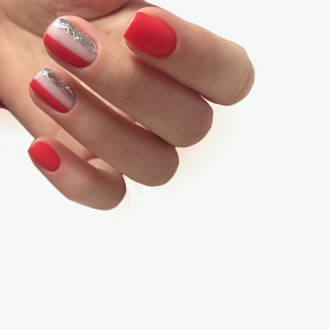 Если на ногтях присутствует база в нейтральном оттенке, то полоска обязательно должна выделяться, например быть блестящей. Вот именно в этом варианте уместна будет фольга яркого цвета.