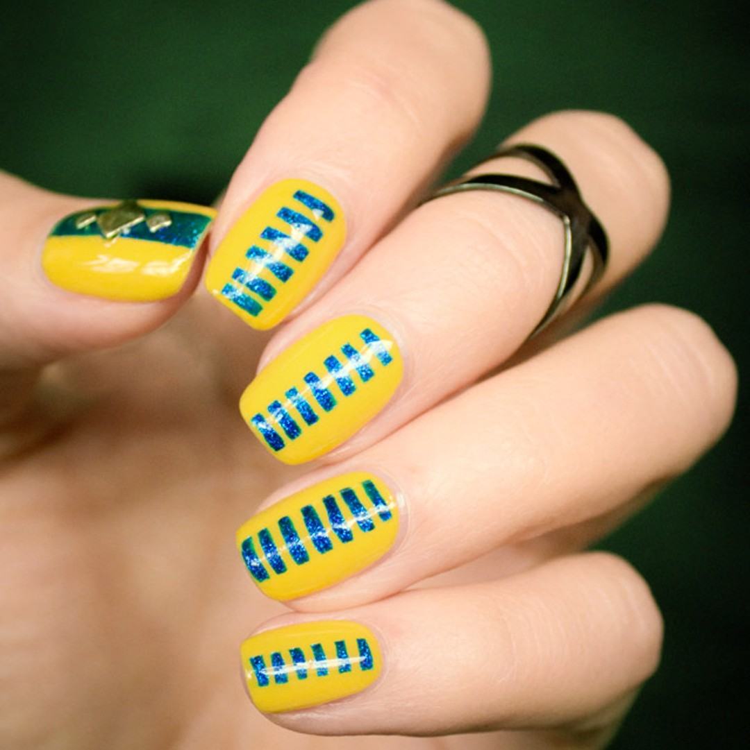 Можно также покрасить ногти, приклеить полосы, а затем снова покрасить лаком другого цвета. Так получают цветные полоски.