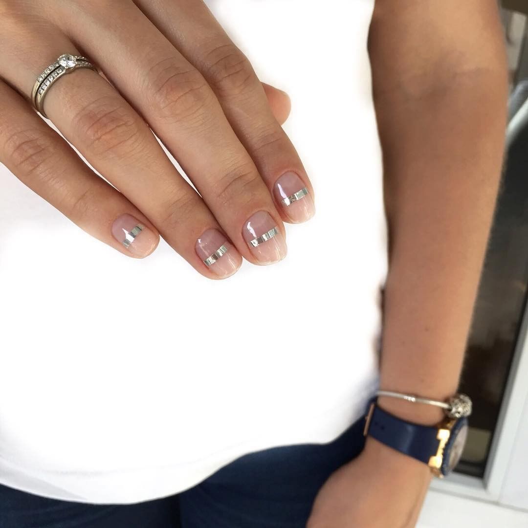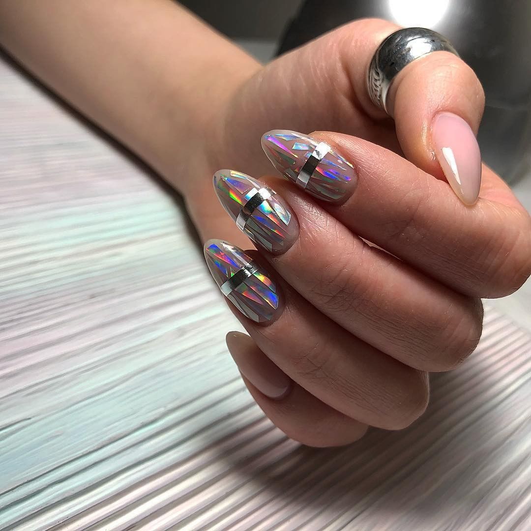 Серебряные полоски в маникюре выглядят достаточно элегантно. Фольга может быть как в цвете «металлик», так и с эффектом голографии. Такой дизайн может быть разбавлен небольшими пациентами в виде страз или акцентом с небольшим рисунком на 1 ногте.