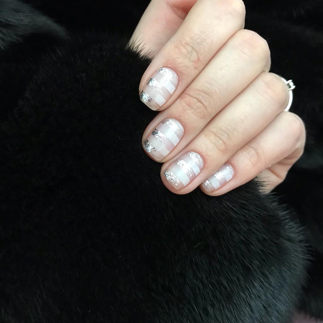 Вариантом для праздника и торжества станут полоски из блесток. Для того, чтобы избежать перегруженности, необходимо выполнять такие полоски на прозрачную поверхность.