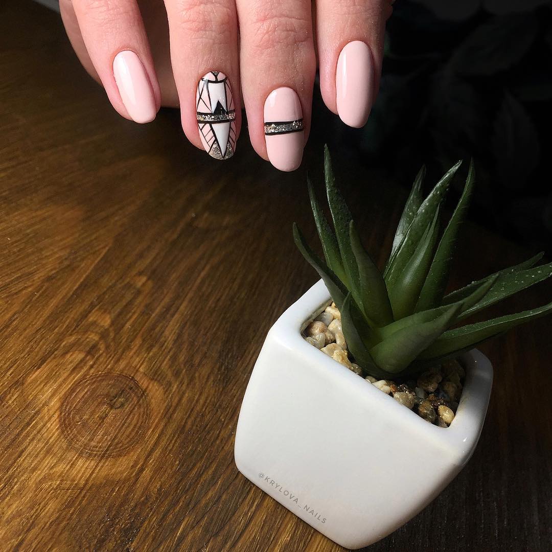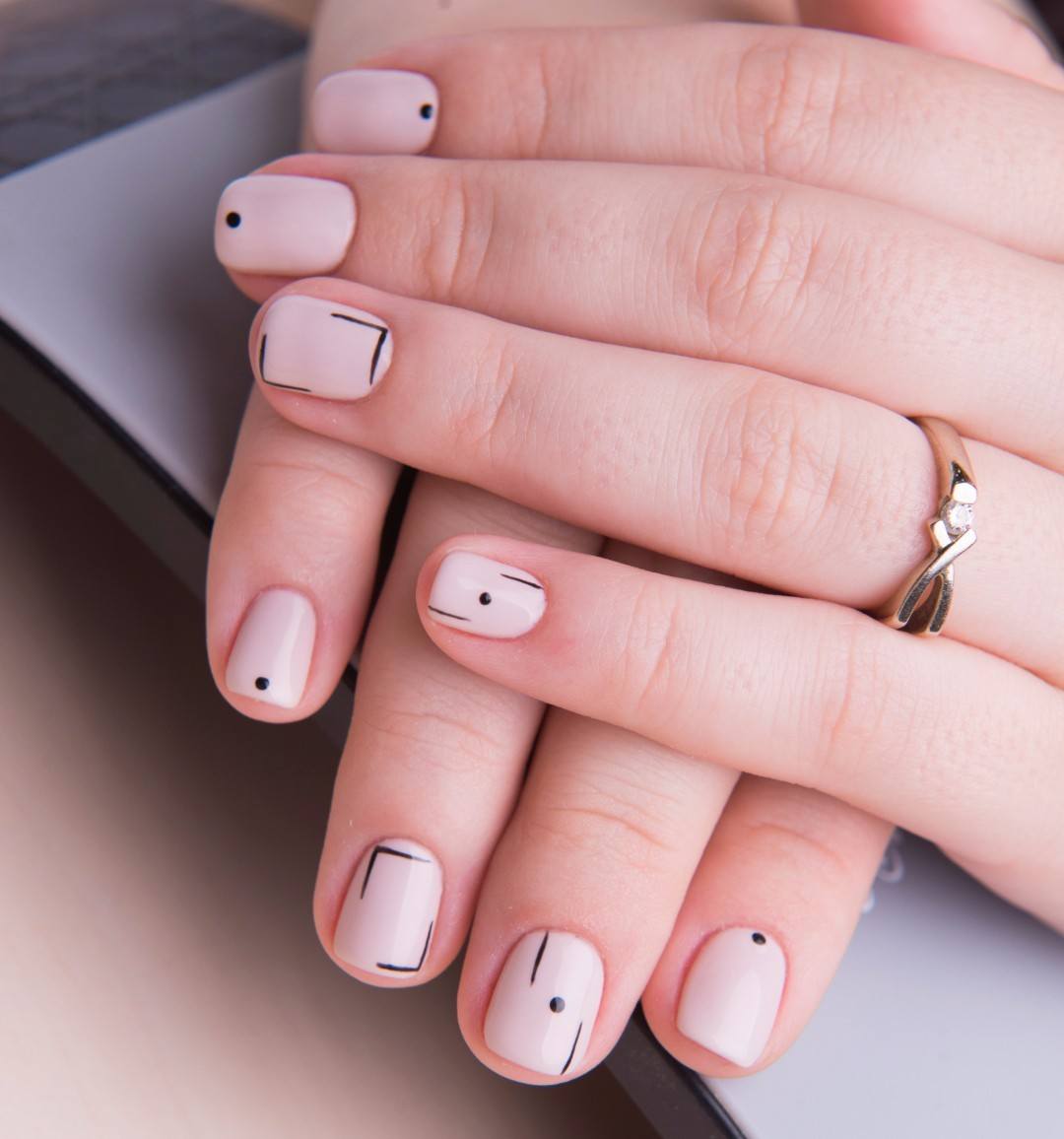 На невзрачных на первый взгляд оттенках ногтей можно создавать настоящие шедевры. К примеру, нюдовые и бледно-розовые тона в основе маникюра хорошо смотрятся с черными точечными узорами, а также в дополнении с белым лаком.