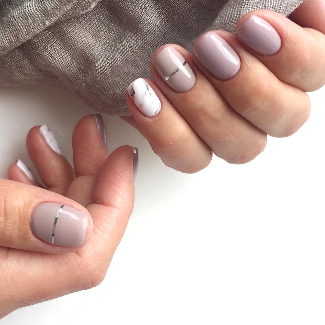 Ваш любимый нюдовый маникюр можно оживить с помощью золотых и серебряных полосок. Актуальными в сезоне 2020 будут такие пастельные цвета лаков: бежевые оттенки, молочные, кофе с молоком, нежно розовые, персиковые, пудра, лавандовые, светло серые, голубые лиловые. Все эти цвета отлично смотрятся на коротких ногтях и на длинных, а что касается формы, то отдавайте предпочтение мягкой квадратной форме и всеми любимой миндалевидной, они будут фаворитами в 2020 году.