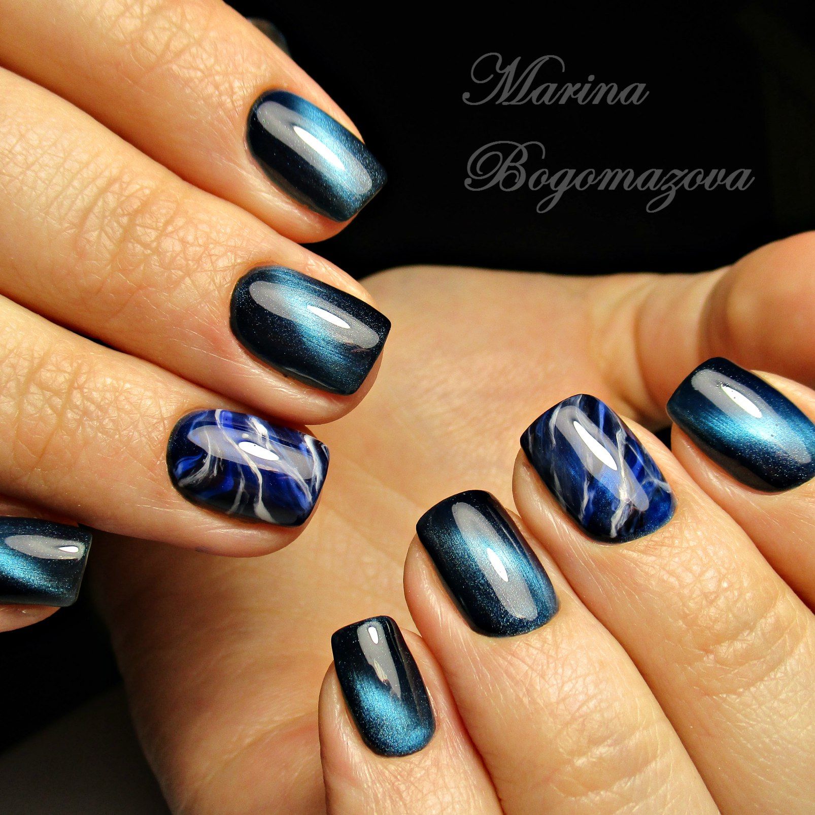 Отличный маникюр в синем цвете подойдет для любого сезона и события. Переливы добавят синему благородного вида и особого шарма. Особенно это касается темных оттенков. Синий маникюр любого оттенка, но с эффектом «кошачий глаз», отлично будет гармонировать с любым нарядом и украсит даже короткие ноготки. Эффектно смотрится и матовое однотонное покрытие без дизайна.