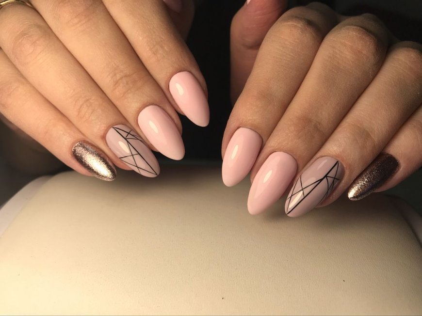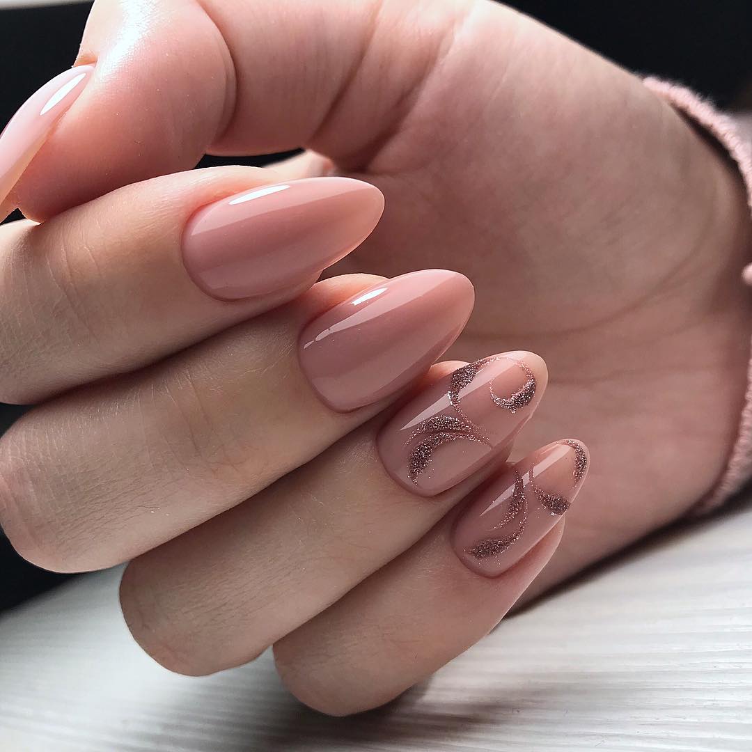 Эта форма ногтей подходит абсолютно всем женщинам. Короткие ногти овальной формы – идеальный вариант для добавления всевозможных орнаментов. Сочетайте разные нюдовые оттенки с абстрактными и геометрическими рисунками. Помимо цветочного орнамента красиво будет смотреться небольшой стилизованный нейл-арт в виде ягод. Геометрию можно сочетать с дизайном «перепелиное яйцо» и блестками.