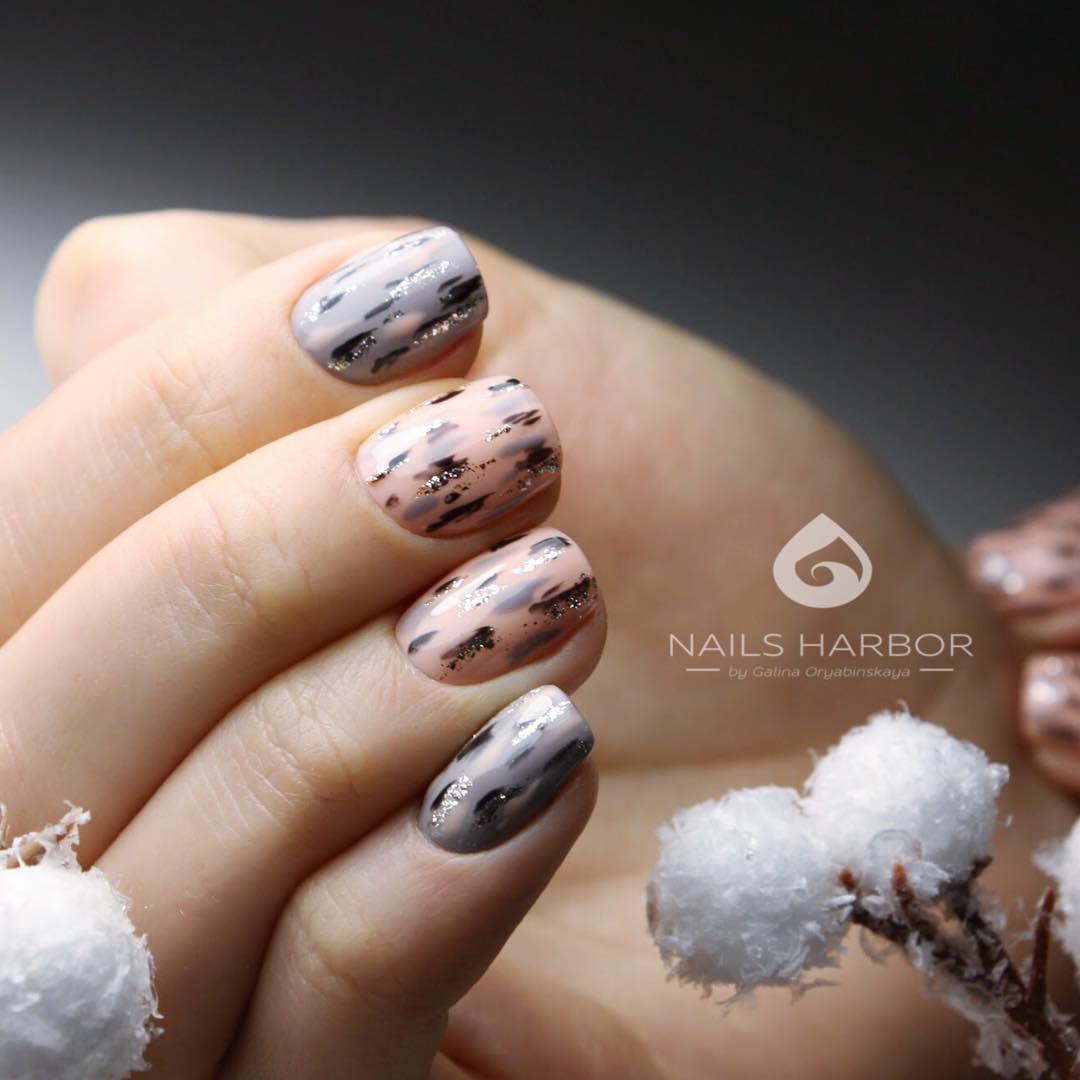 Дополнением к хаотичным изображениям станут прорисованные гелем–краской геометрические элементы — чаще всего это круги. Пример популярной абстракции — мазки или брызги краски. Выполняют их на одном или на всех ногтях. Дополнительно можно нанести надписи, паутинку. Главное, не забыть зафиксировать рисунок матовым или блестящим топом в нюдовых оттенках.