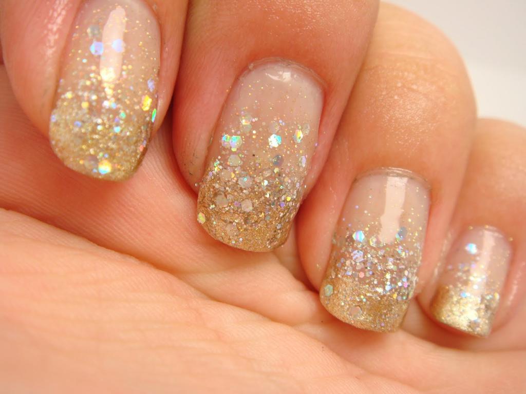 - Глиттером вы подчеркнете форму ваших ногтей, если нанесете небольшое количество блесток на выступающий край ногтя. Вы можете использовать как золотые и серебристые оттенки, так и более яркие.