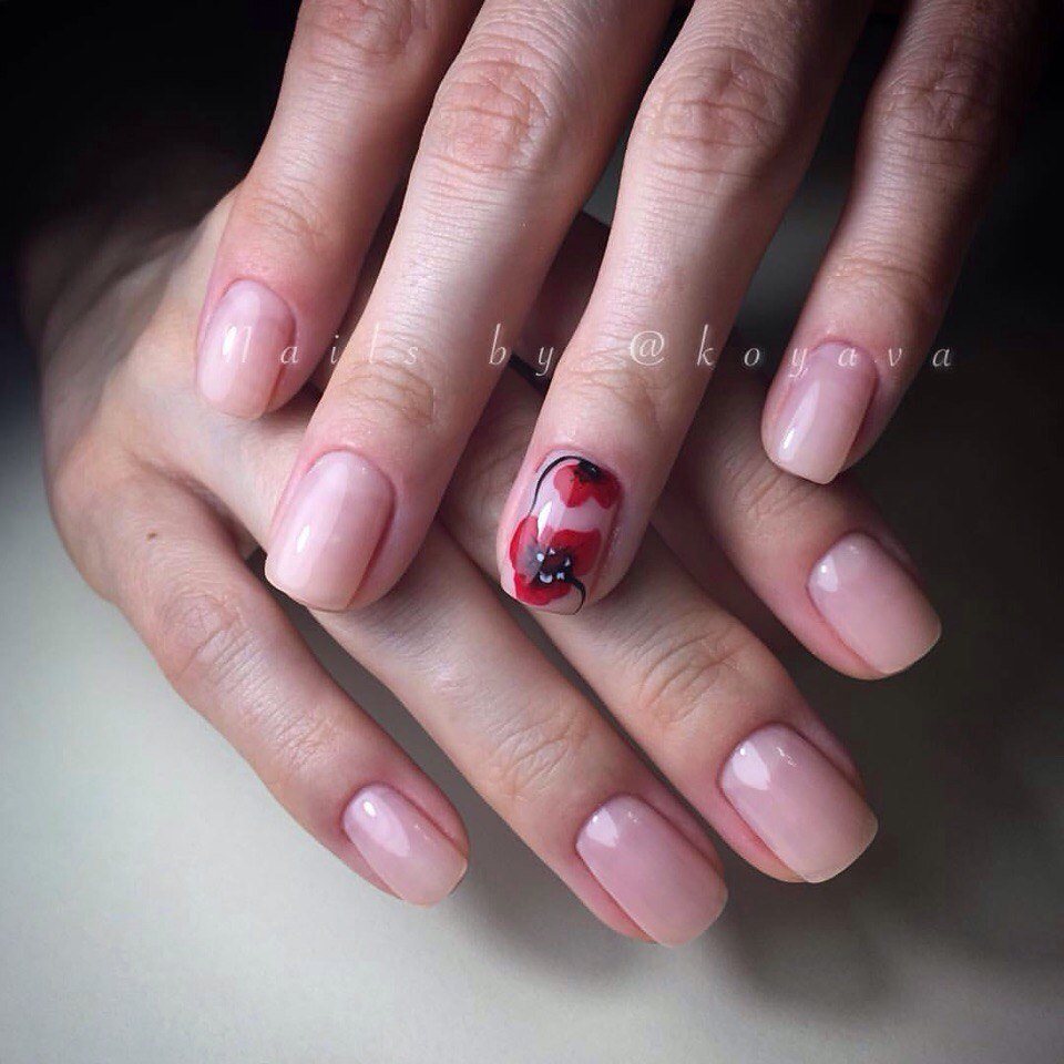 Маникюр натуральных оттенков служит идеальной базой для рисунков. Сейчас в тренде детские картинки в стиле «наив», графика, минимализм и различные надписи. Абсолютным же хитом на все времена являются цветочные мотивы. Но, если раньше это были сложные акварельные рисунки, то в этом году лучше придерживаться принципа «чем проще, тем лучше».