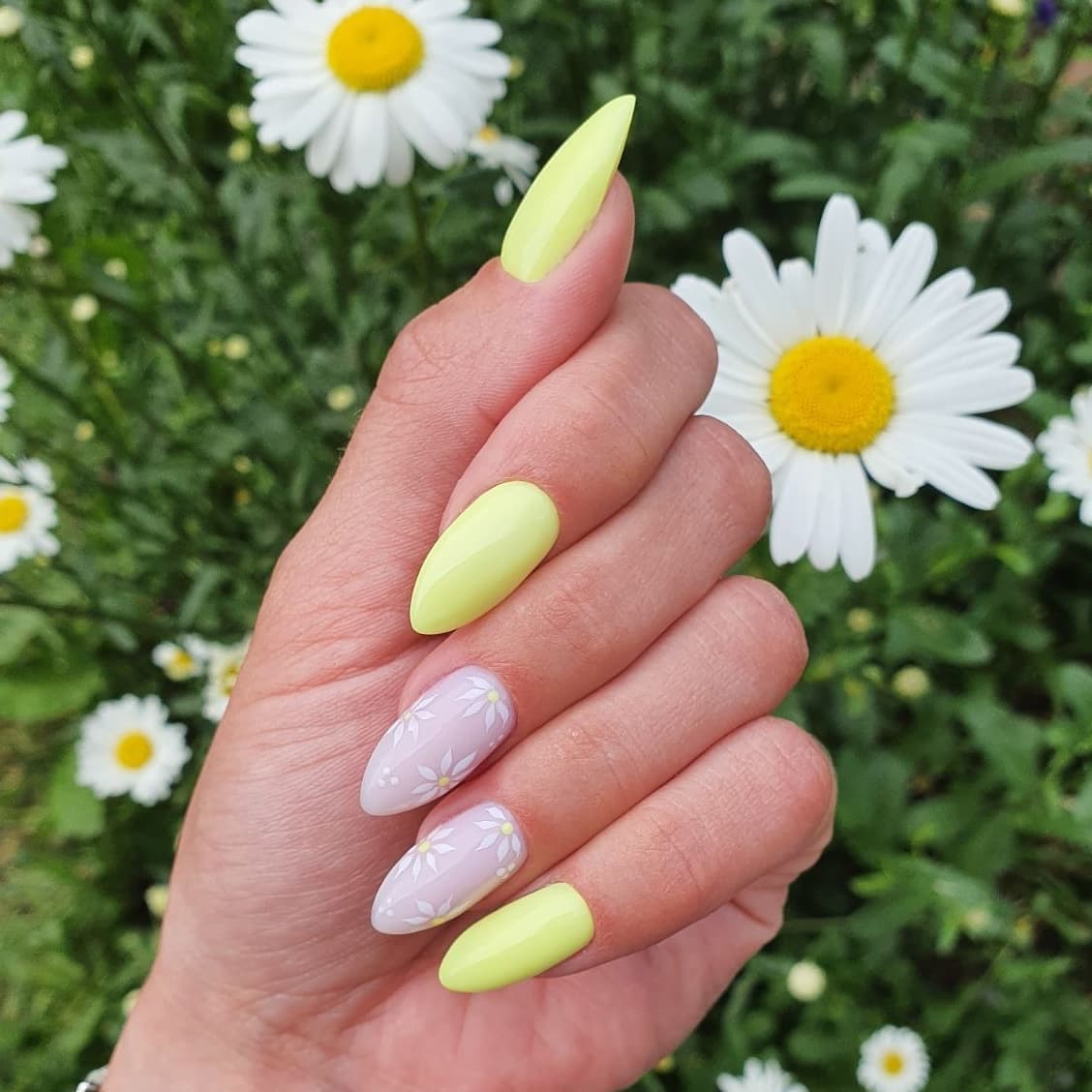 Также в качестве пары к нежно-желтому маникюру всегда можно подобрать пастельные оттенки: фиолетовый, голубой, салатовый и другие. Здесь работает логика схожей контрастности. Таким образом можно сделать летний желтый маникюр, который будет ярким и модным, но при этом не слишком заметным и бросающимся в глаза.