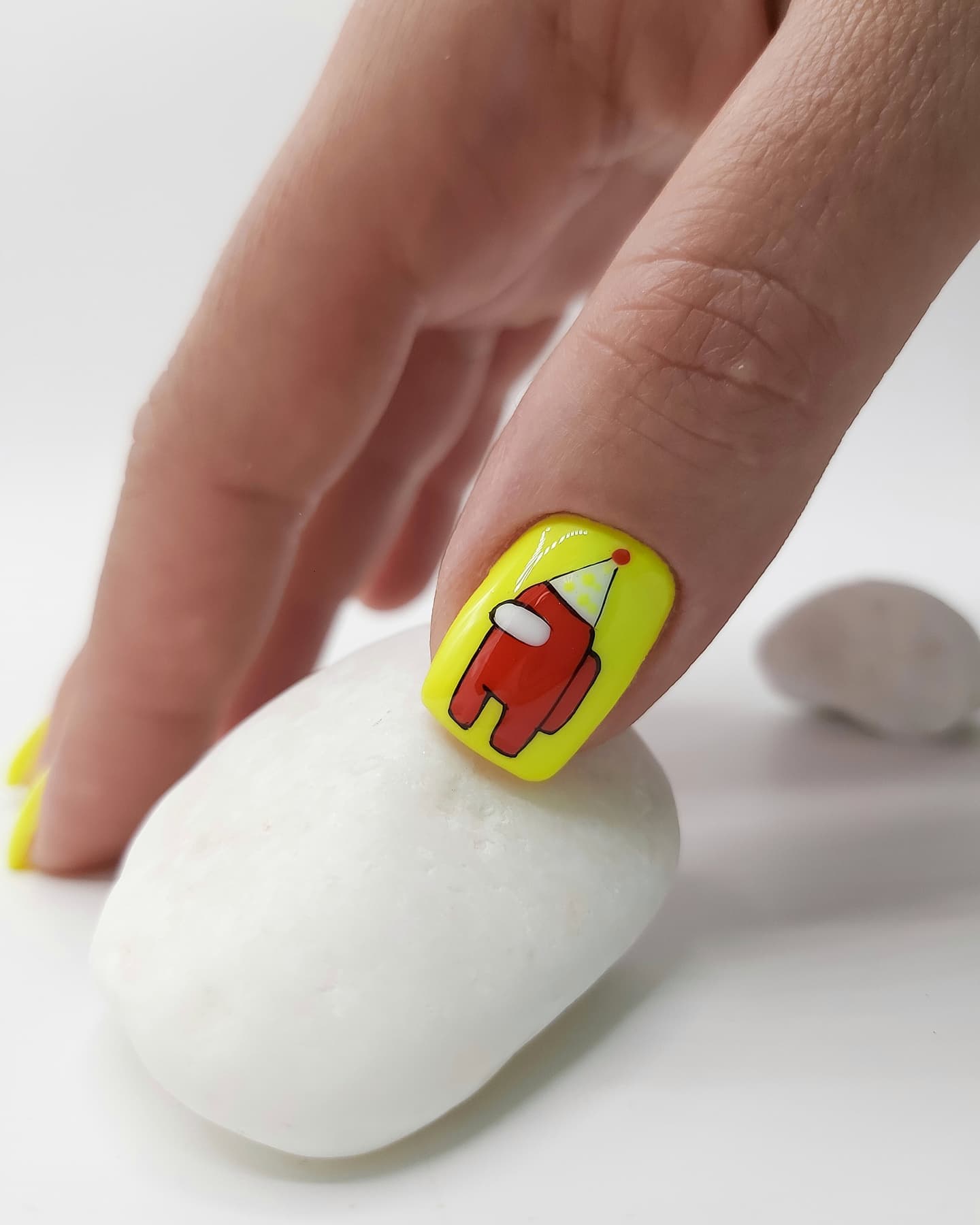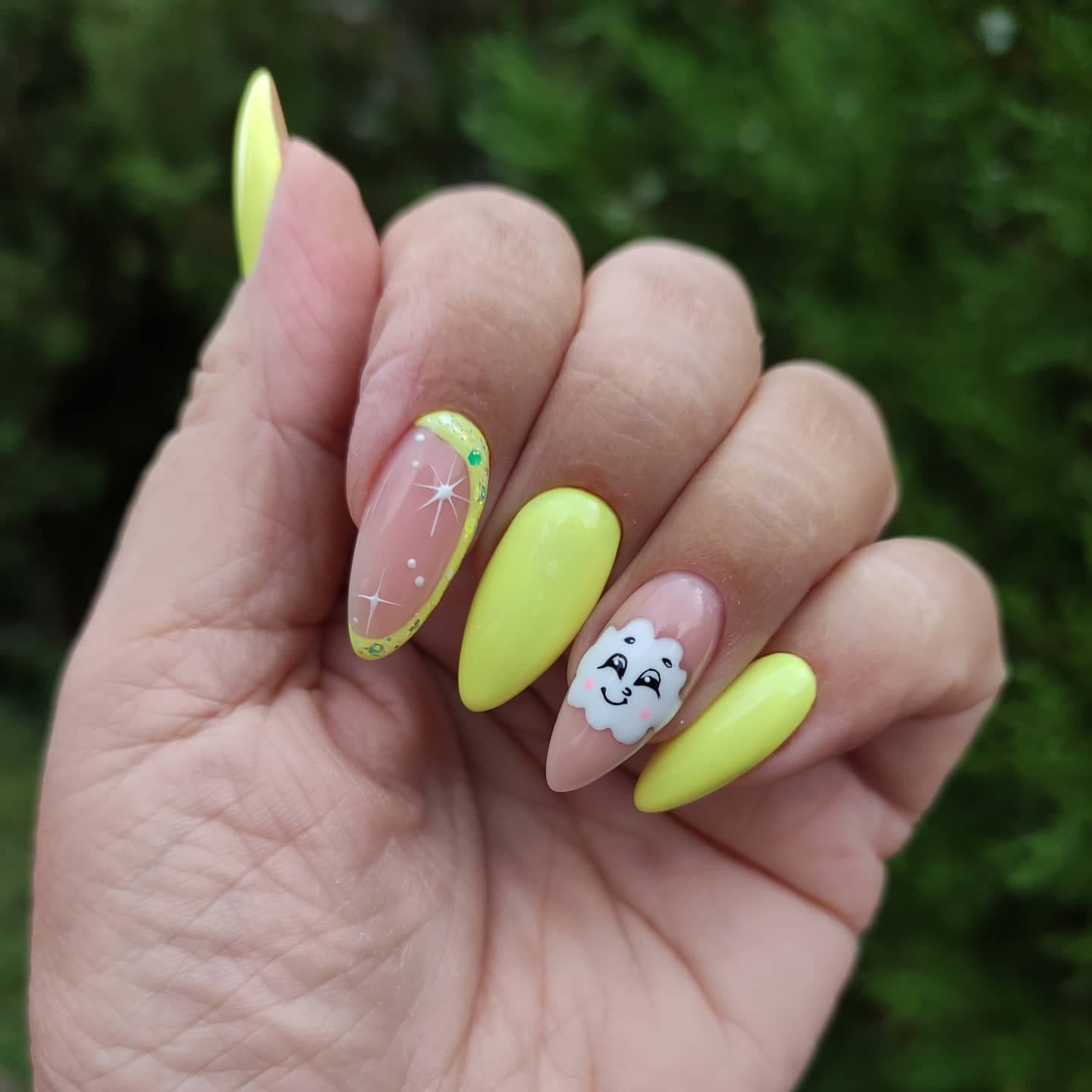 Для любителей экспериментов желтые ногти можно превратить в уникальные смайлики и emoji. Вырисовывая улыбки, бантики, глазки, свои пальчики можно наделить прекрасным настроением.