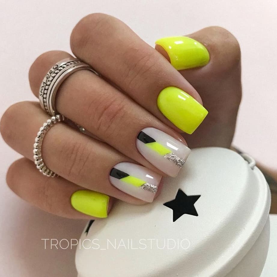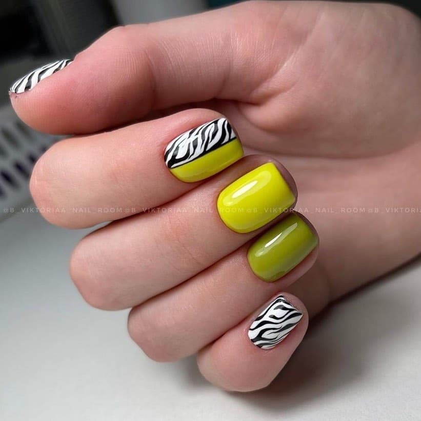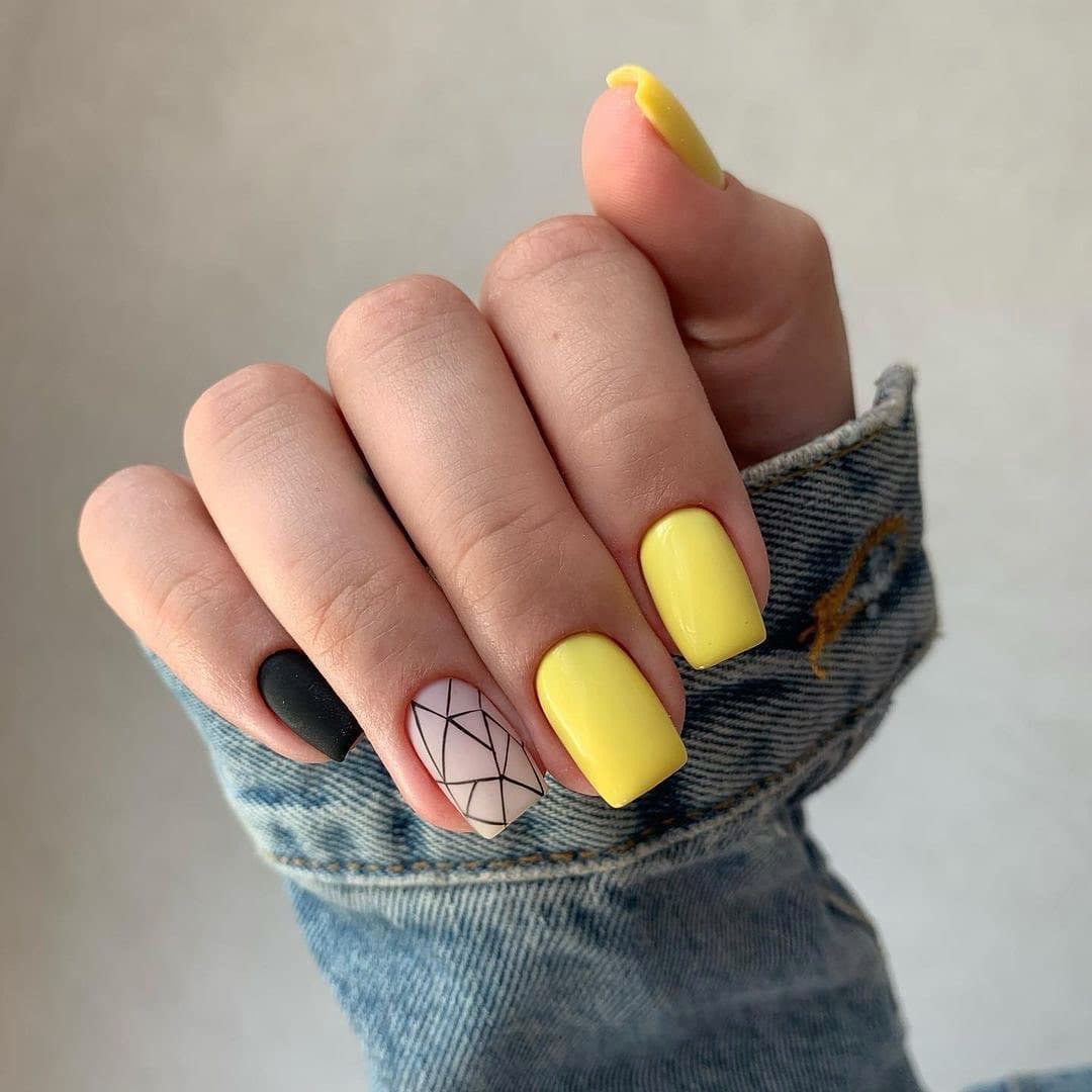 Одно из самых классических сочетаний — микс черного и желтого. В этом случае можно не стесняясь выбирать самые яркие тона этого солнечного цвета — базовый черный или серебряный их приглушит. Маникюр в черно-желтом цвете в 2022 будет смотреться ярко, дерзко и стильно.