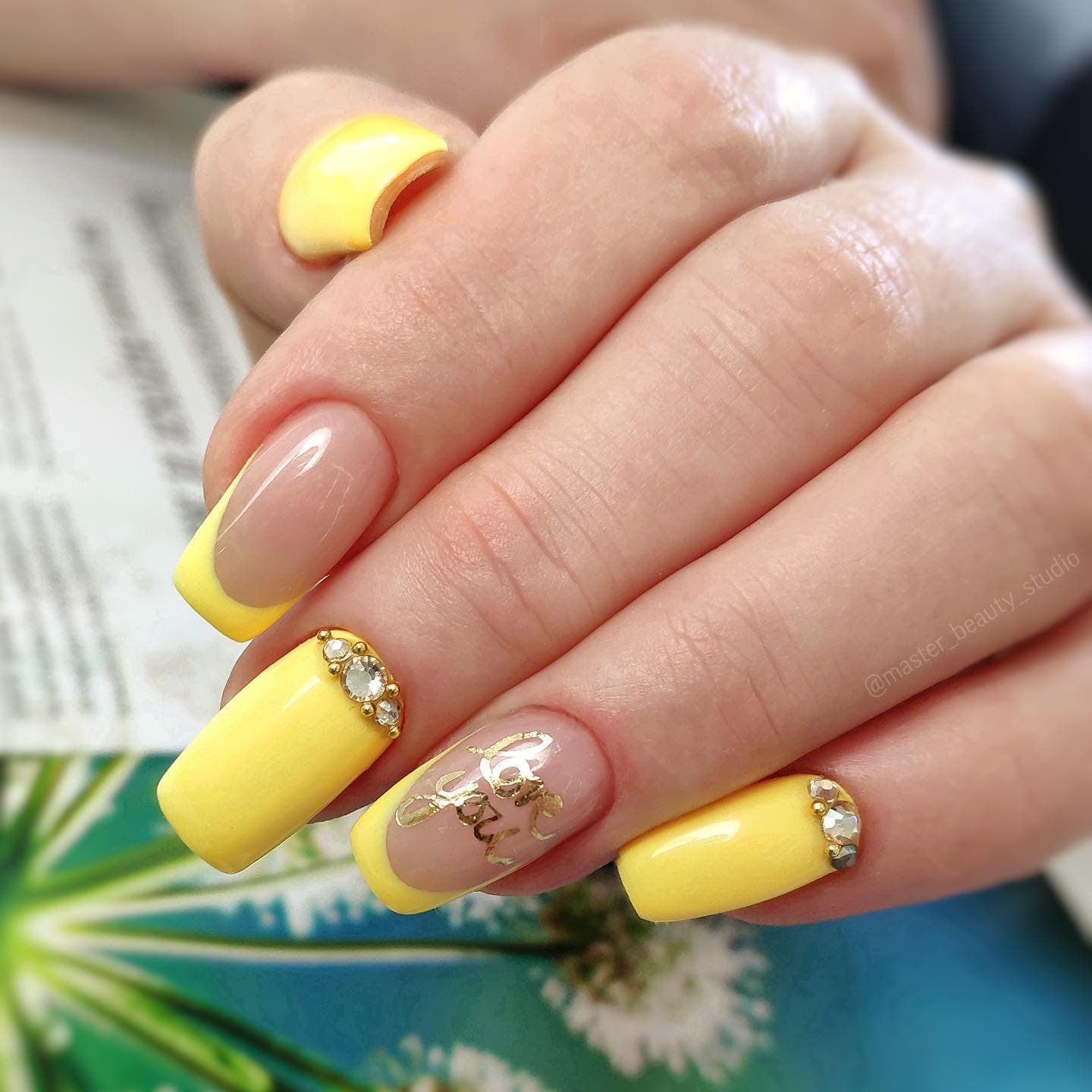 Желтый маникюр с гель лаком отлично буде смотреться с любым декором, будь то стразы или рисунок. Причем более выигрышно будет смотреться рисунок в выраженном контрастном цвете: черном, красном, зеленом.