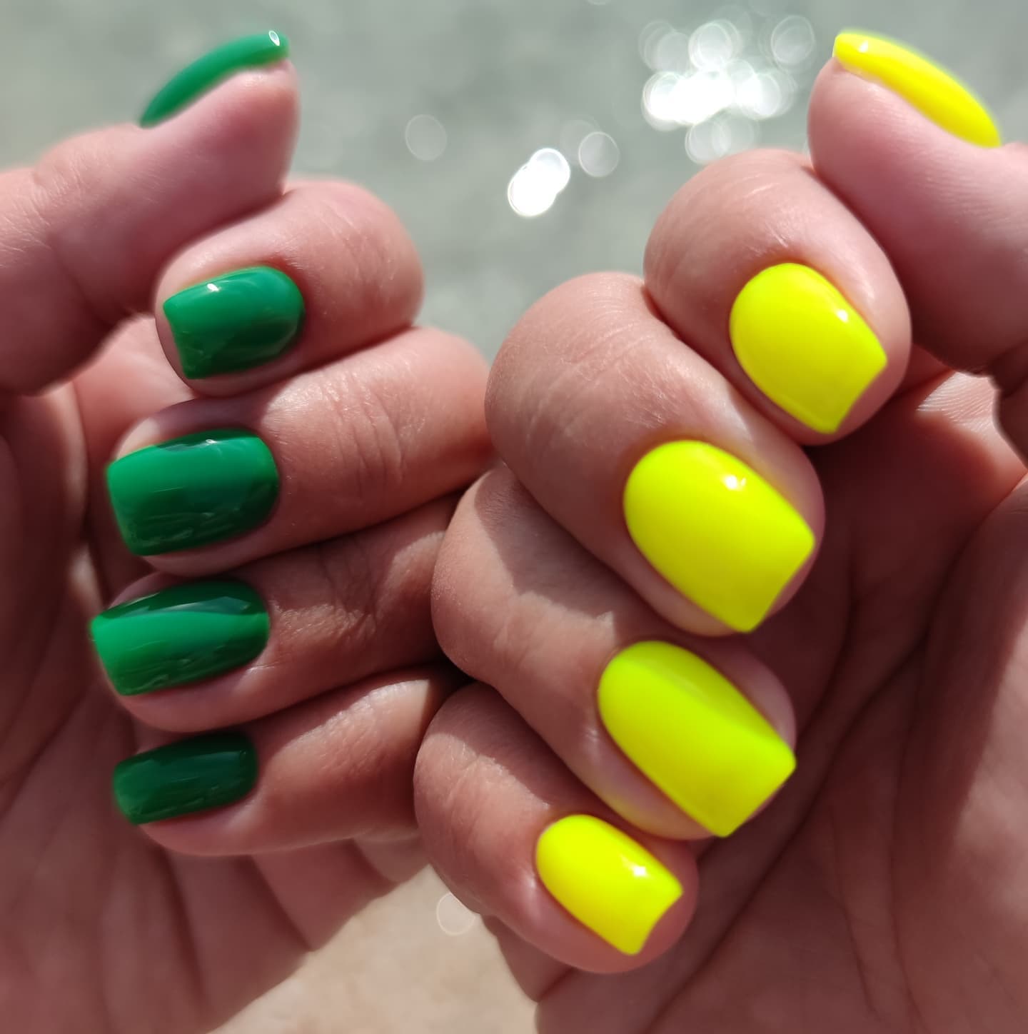 Первые сомнительные претенденты — красный и оранжевый. Несмотря на то, что они вызывают такие же яркие и теплые ассоциации, как и желтый, с таким миксом легко переборщить и в итоге маникюр будет выглядеть слишком ярко, что повлияет на весь твой образ. Если ты хочешь использовать эти цвета на одном ногте, убедись, что их соотношение не равное. Например, если 80% площади ногтей будет желтого цвета, а на остальных 20% будут вкрапления красного и оранжа — будет отлично. То же правило работает и наоборот.