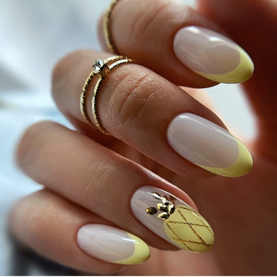 Несмотря на то, что в летнем маникюре желтого цвета приветствуется большое количество декора и акцента, если у вас очень короткие ноготки, все же стоит ограничить себя в «полете фантазий» двумя-тремя акцентами. Если ногти чуть отросшие, то уже можно смело экспериментировать.