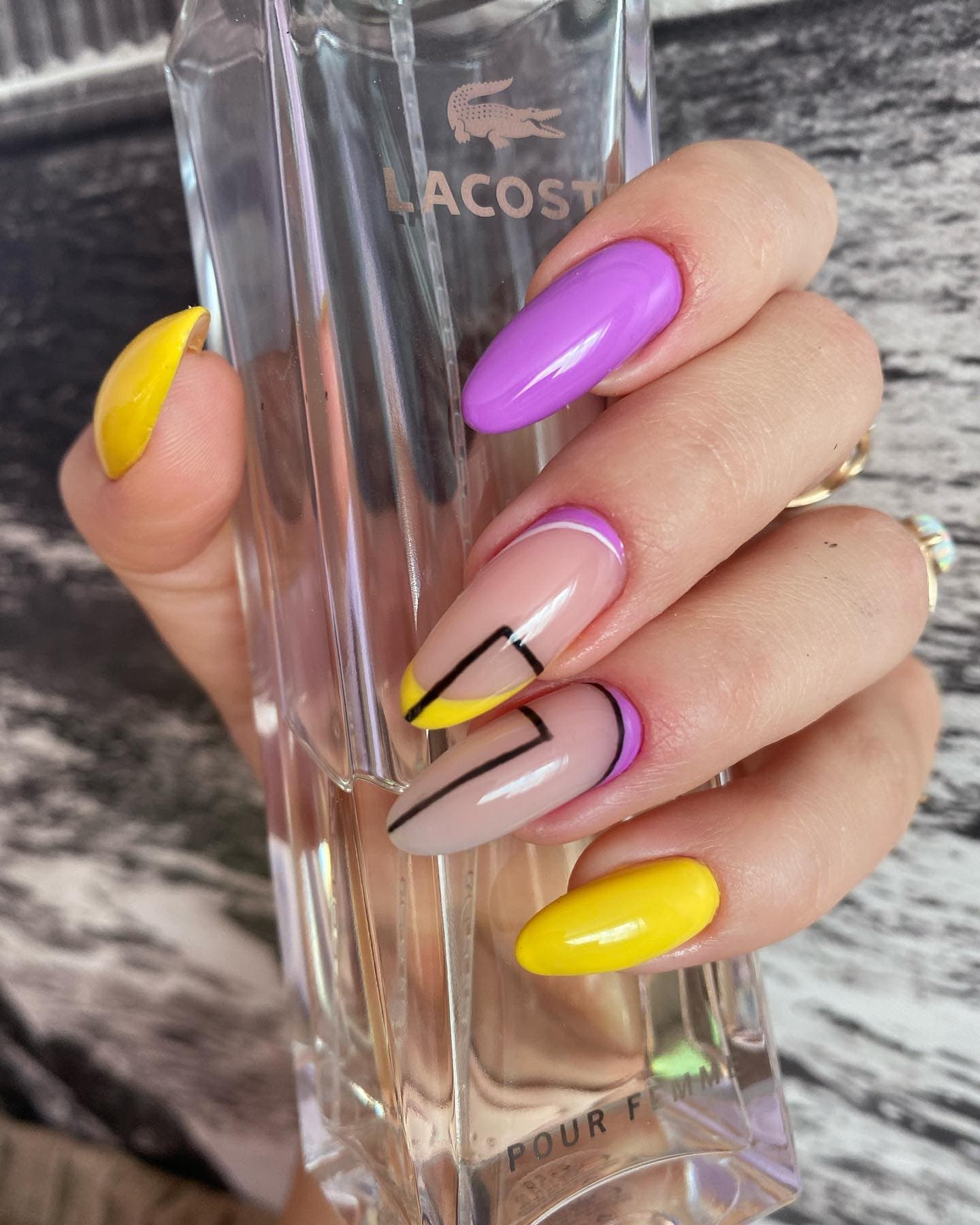 Креативный дизайн. Яркий желтый лак можно сочетать с фиолетовым, лиловым, синим, бирюзовым, вишневым, кораловым цветами. Все перечисленные цвета можно использовать в разной насыщенности оттенков.