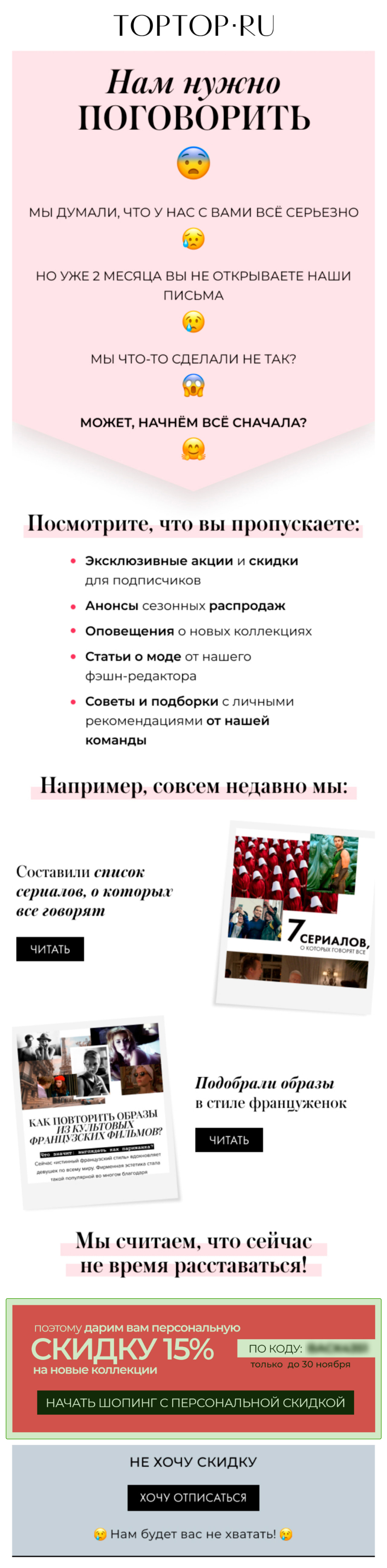 Реактивация оттока. Цель механики — напомнить клиентам о бренде и мотивировать на совершение новых заказов. Если клиент не читает письма, отправляем письмо-напоминание о бренде через два, три и четыре месяца после последнего открытия письма: