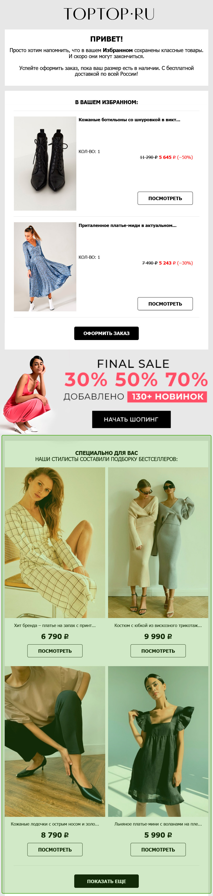 Напоминание о товаре в «Избранном». Цель механики — вернуть клиентов в магазин и мотивировать их на совершение покупки. Состоит из трех писем — через два дня после добавления товара в «Избранное», через три дня после первого письма и уведомление при снижении цены: