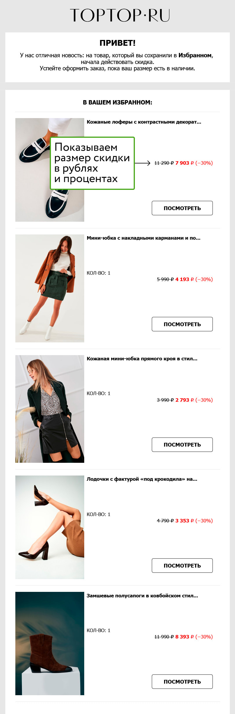Уведомление при снижении цены в «Избранном» отправляется, если товар подешевел минимум на 100 рублей. В письме показываем только товары со скидкой