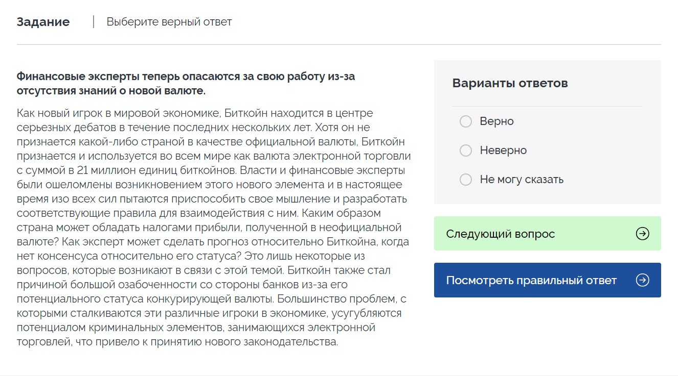 Тест на анализ вербальной информации проводится с использованием серии коротких текстов, в которых выносятся на обсуждение случайные темы. Некоторые из них могут иметь отношение к работе, а другие нет. Как правило, предварительное знание тем, описанных в этих текстах, не является необходимым. Это сделано для выявления вашей способности работать с новой информацией. К каждому отрывку текста прилагается несколько вопросов с вариантами ответов и ограничением по времени.