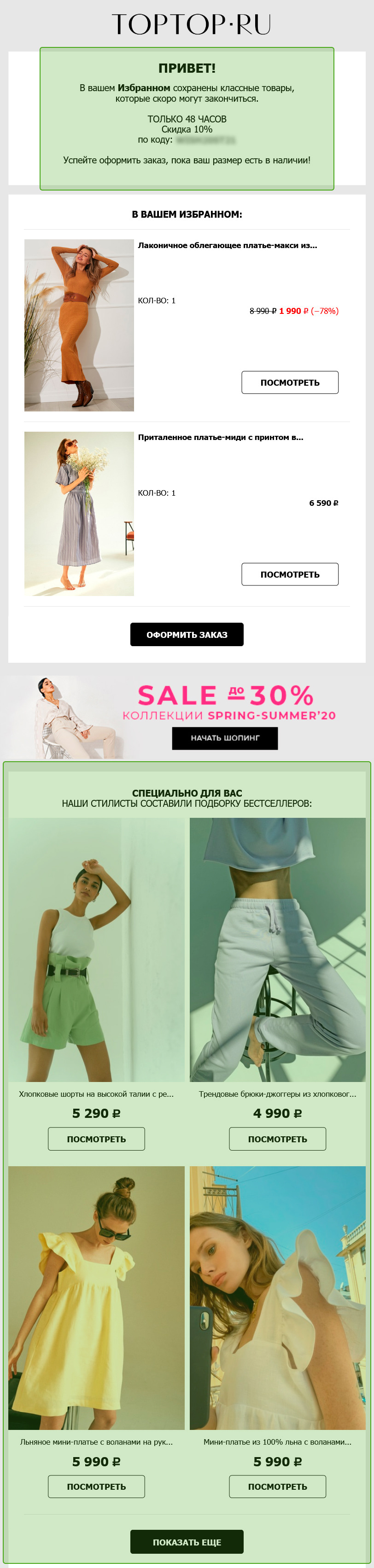 Второе напоминание о товаре в «Избранном» с персональными рекомендациями и промокодом
