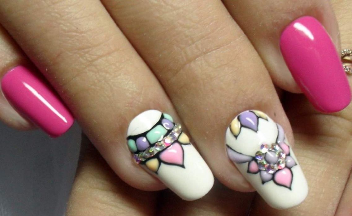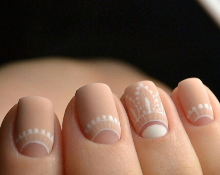 Универсальный фоновый цвет в повседневной носке дополняется матовыми или глянцевыми узорами, геометрическими фигурами спокойных оттенков, флористическими узорами, кружевом. Один или два пальца можно украсить стразами, окантовывающими лунулу.