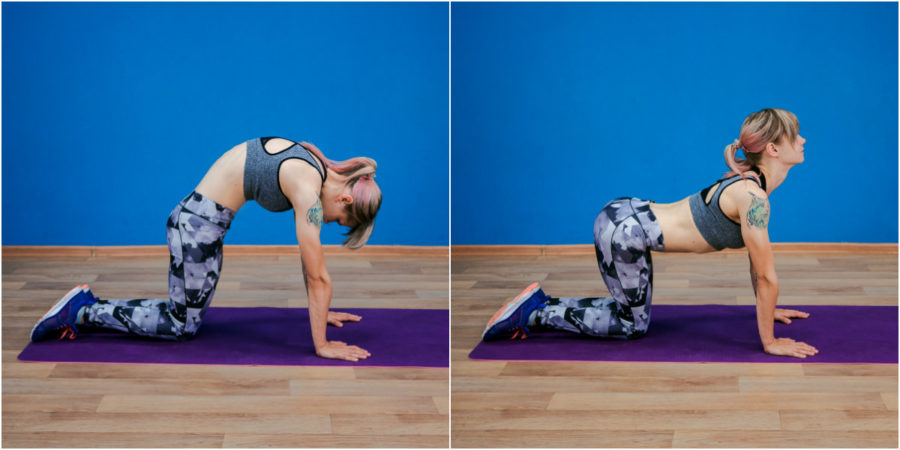 Для выполнения позы кошка-корова займите положение на полу на четвереньках. Вдохните, взгляните вверх, расправьте грудь, прогнитесь животом к полу, копчик должен смотреть в потолок. Выдохните, опустите голову между плеч, скруглите спину, подверните к себе копчик и втяните живот, будто бы вы нажали на кнопку на животе.