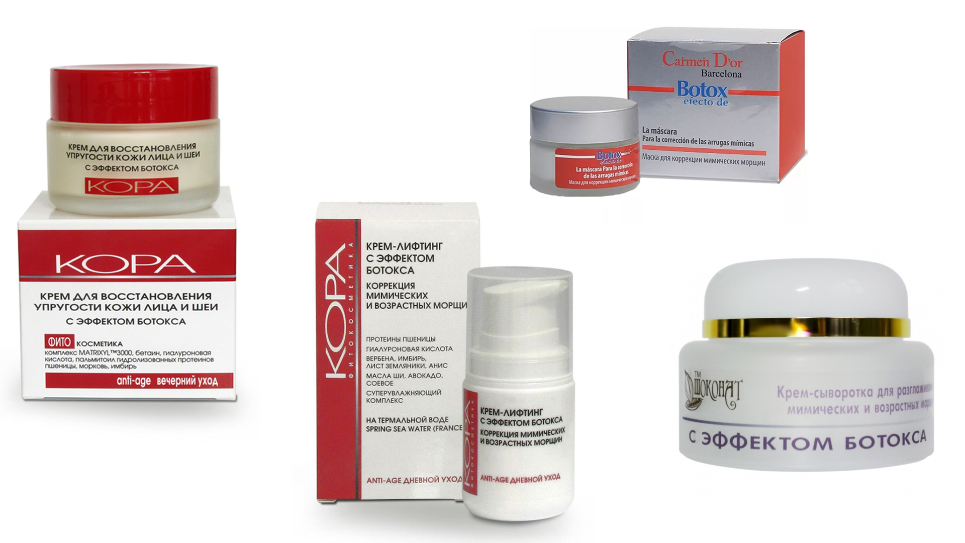 В продаже можно увидеть косметические средства «с эффектом ботокса». Предполагается, что они могут заменить инъекции, но, к сожалению, чудес не бывает: кремы и сыворотки действуют лишь на поверхностные слои эпидермиса, не проникая глубже.