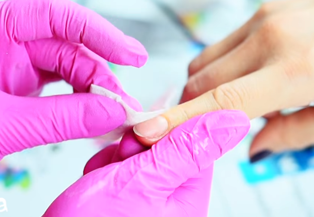 Предварительная подготовка та же, что и при гелевой коррекции – это обработка рук антисептиком и удаление лакового покрытия, если таковое имеется. Кутикулу также отодвигаем апельсиновой палочкой или маникюрной лопаткой.