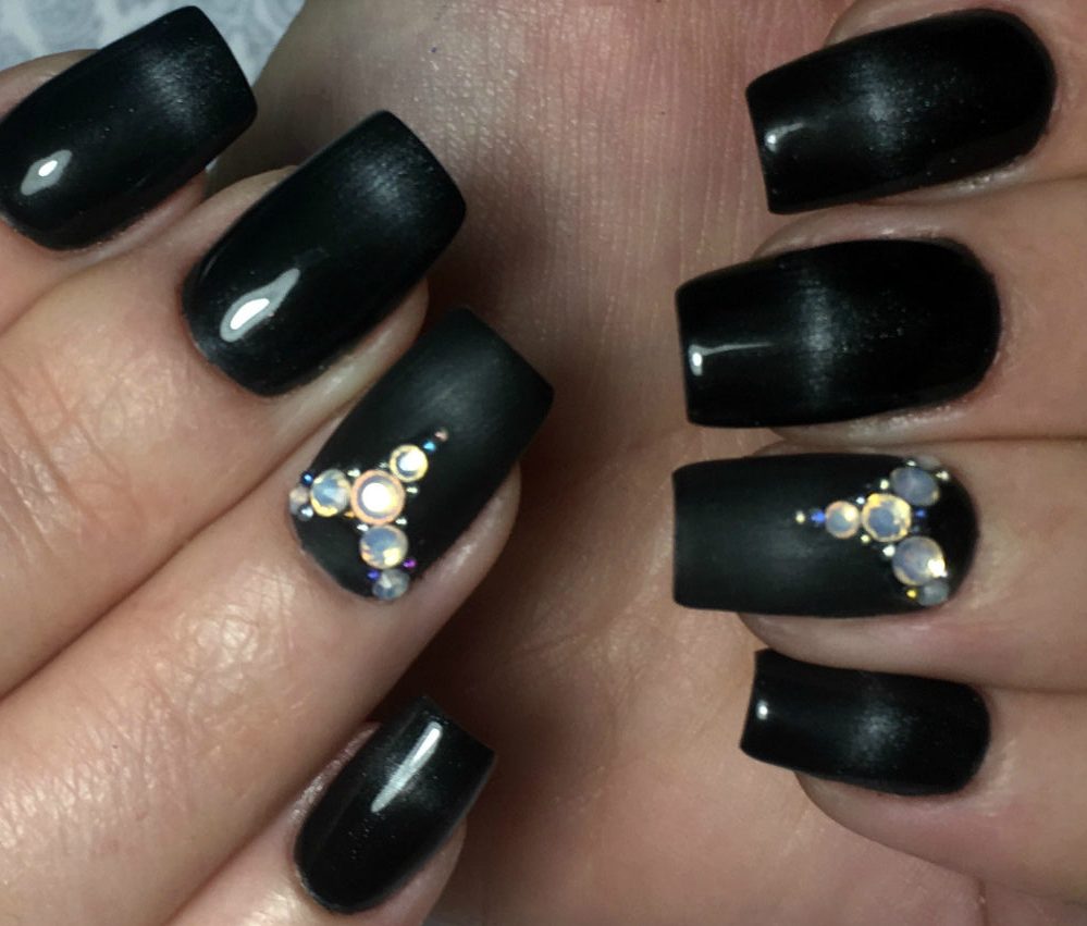 Маникюр можно украсить блестящими камешками. Можно выделить только один ноготь. Или же использовать в качестве декора стразы на каждом пальце. Для этого на последний слой гель-лака нужно просто приклеить стразы, покрыть ТОПом и отправить на сушку в лампу.