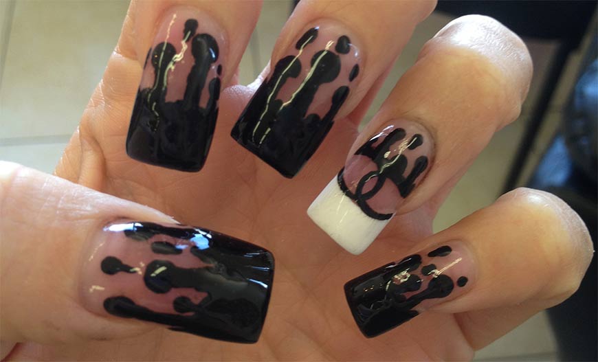 В последнее время стала популярна техника, по которой цвет ногтей на одной руке кардинально отличается по цвету на другой. При этом уместно и необычно смотрится, когда эти цвета переплетаются в градиенте на нескольких пальчиках. Не забудьте нанести рисунки или прикрепить наклейки, покрыв их сверху закрепителем.