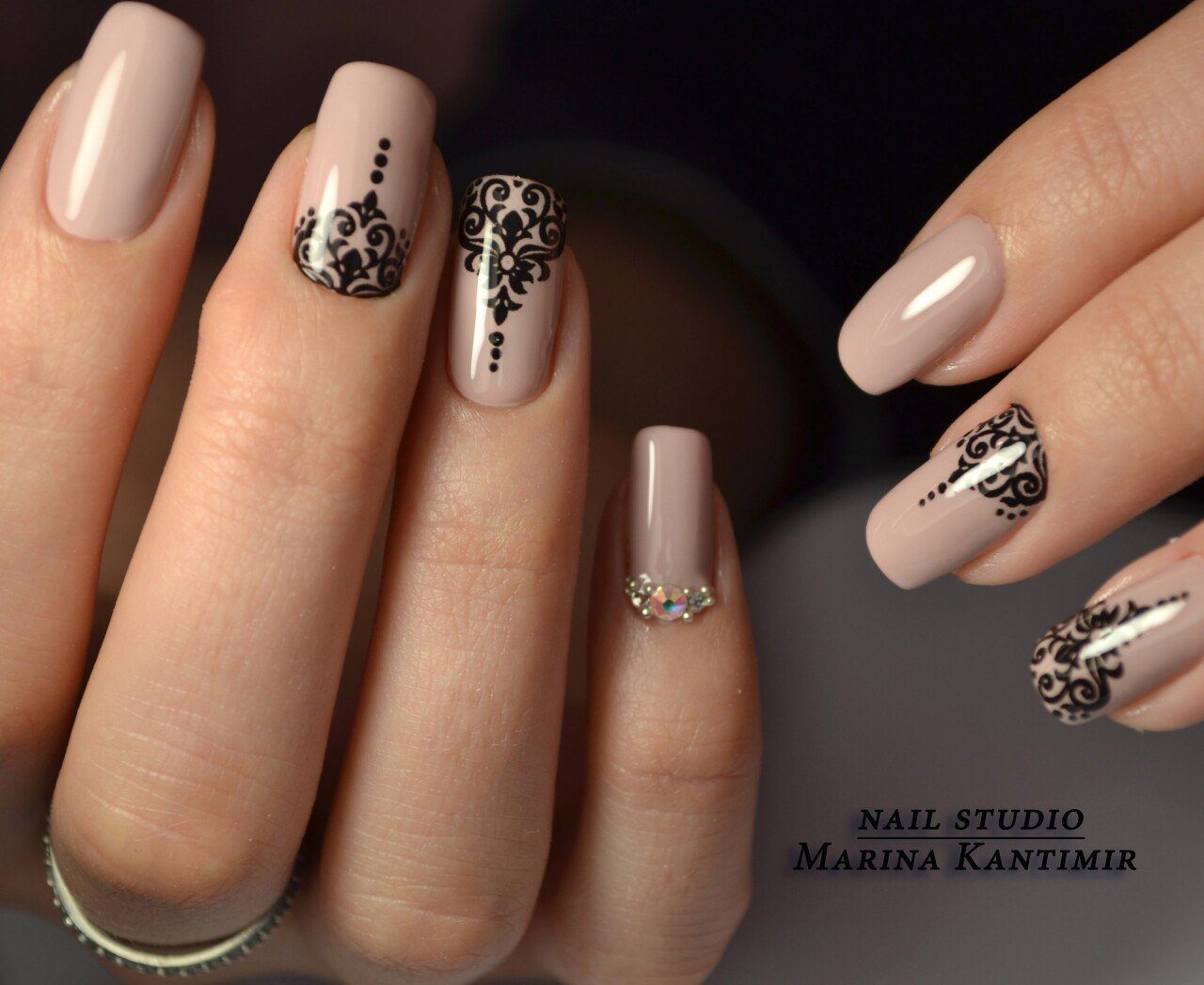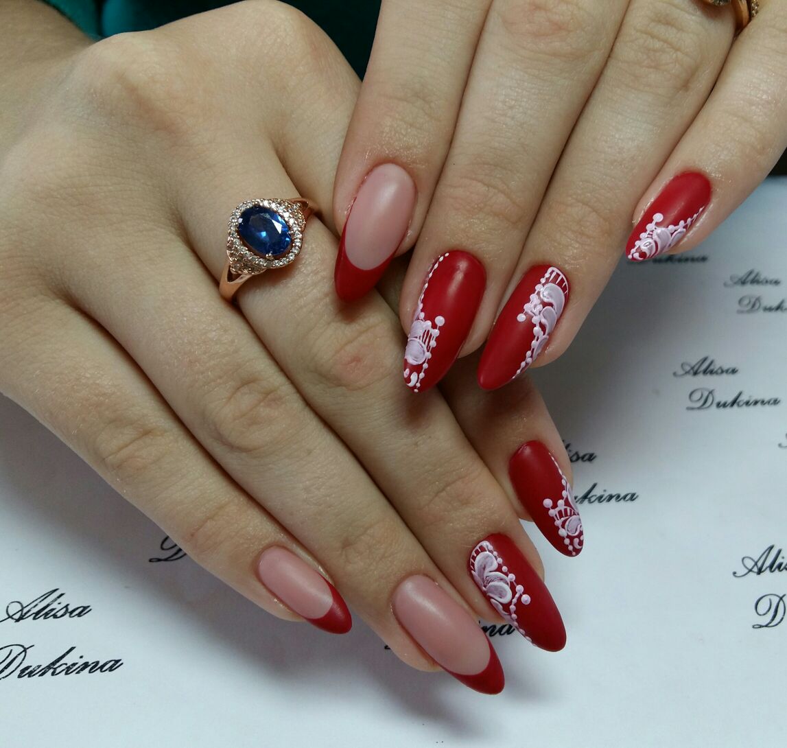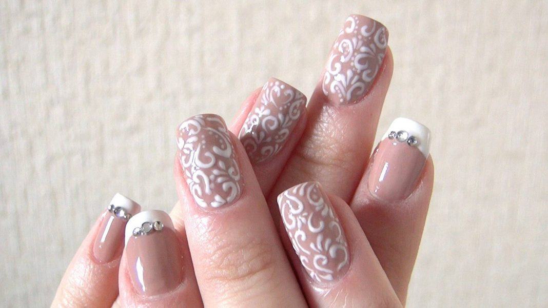 Необычные вензеля, которые переплетаются из одного в другой – это очень женственный вариант для молодой девушки. Кружевной маникюр сделает вас неотразимой. Наносить узоры можно с помощью тонкой кистьи или дотсом. Отдельные элементы можно «пропечатать» фольгой для литья. Этот шикарный и элегантный вариант прекрасно гармонирует с платьем любого фасона и в любых тонах.