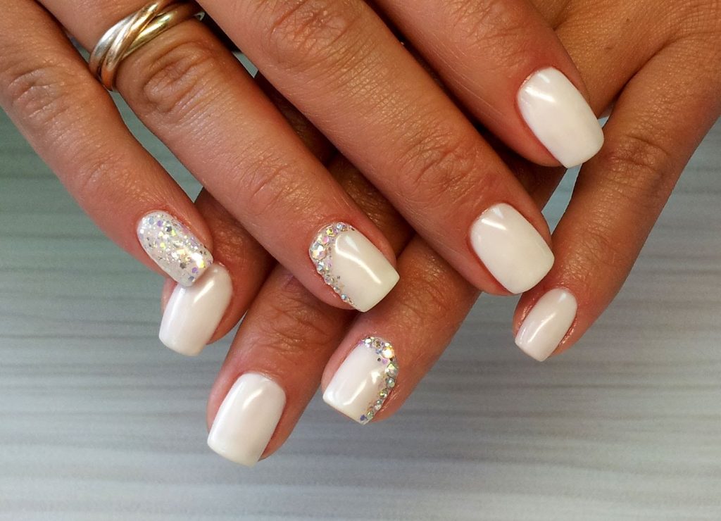Еще один способ сделать блестящий маникюр – вместо страз использовать глиттер. Мастера маникюра предлагают выделить блестками лунку или провести блестящую полоску, покрыть глиттером 1-2 ногтя или сделать на нескольких ноготках глиттерную россыпь-обмре.