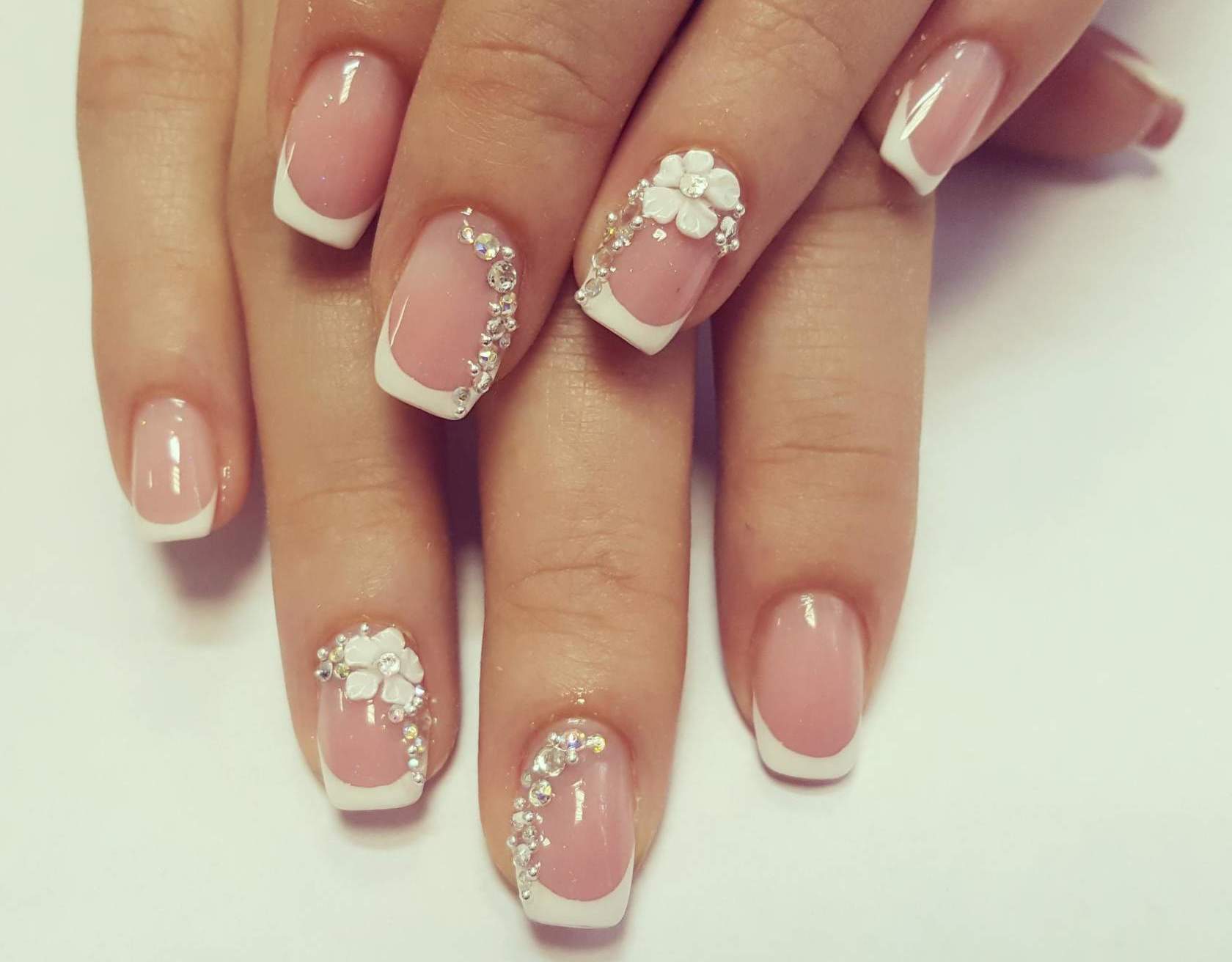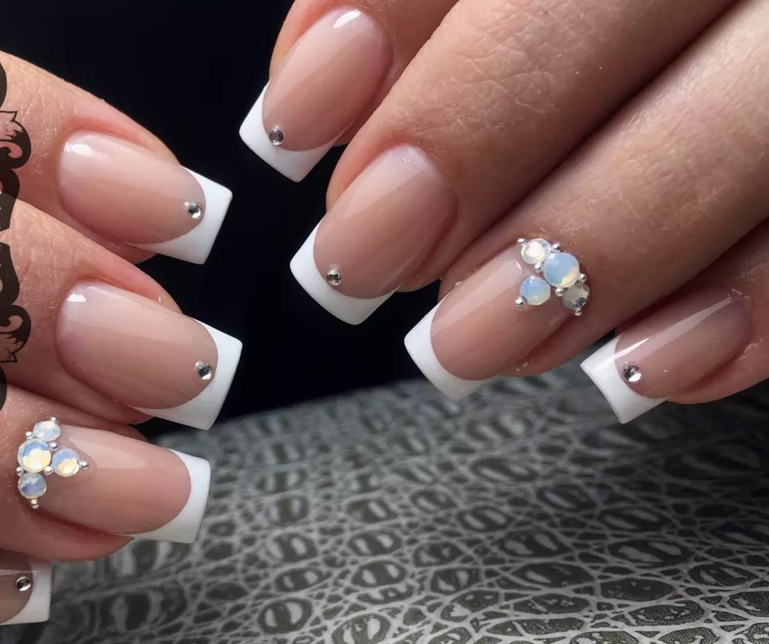 Френч на выпускной можно разнообразить декором в виде лепнины на безымянном пальце или украсить стразами все ноготки. Так дизайн будет выглядеть менее обыденно и повседневно.