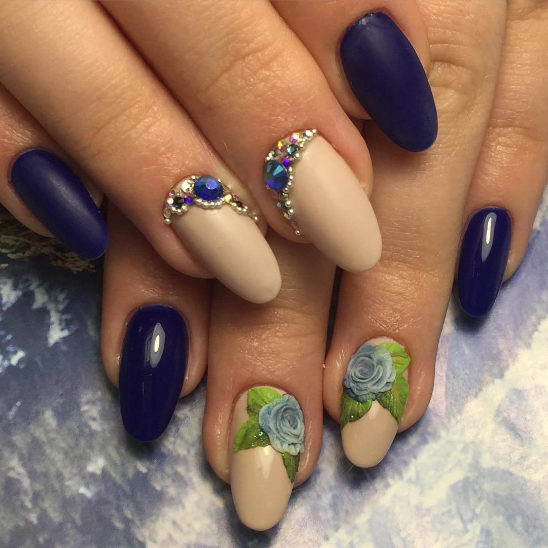 Уже не первый год одним из самых актуальных трендов в дизайне ногтей является использование градиента. Речь идет о сочетании нескольких вариаций одного цвета с уменьшением его насыщенности. Такой маникюр 2017 года может выполняться в разных техниках. К примеру: цвет теряет свою яркость по направлению от корня ногтя к краю или же все соседние ногтевые пластины несколько отличаются друг от друга по насыщенности. Еще одна интересная идея – «икорный» маникюр. Для его создания используются специальные миниатюрные бусинки, которые наносятся на всю поверхность ногтя или его часть – абстрактно или же в виде френча. Оригинально и необычно смотрится сочетание глянцевого и матового лака, цвета можно выбирать контрастные или схожие. Уместны ли яркие оттенки в торжественном дизайне ногтей для выпускного вечера? Вопрос спорный – многие девушки предпочитают выглядеть на этом празднике достаточно скромно и элегантно. Но если ваше платье яркого кобальтового цвета и вы хотите выделиться среди прочих выпускниц, не раздумывая выбирайте синий маникюр на выпускной вечер, выполненный в подходящем оттенке и настроении.