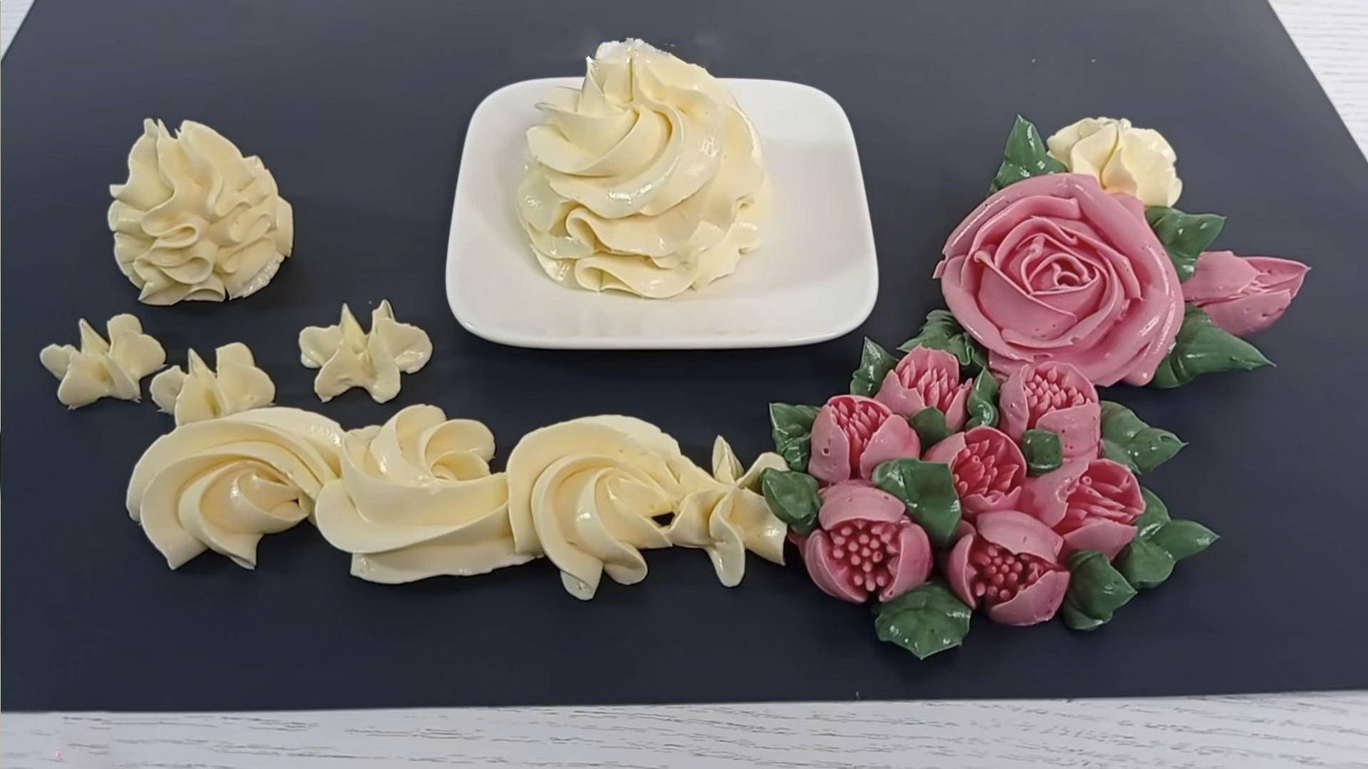 Готовый крем получается очень стабильным, глянцевым. Можно сразу приступать к украшению торта цветами, листочками и роскошными узорами.