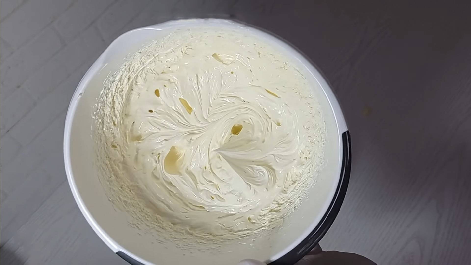 - На предпоследнем этапе во взбитое масло порционно добавляют охлажденную основу (по столовой ложке). Миксер продолжает работать на средней скорости, нужно добиться идеальной однородности смеси. Этап займет 2-3 минуты.