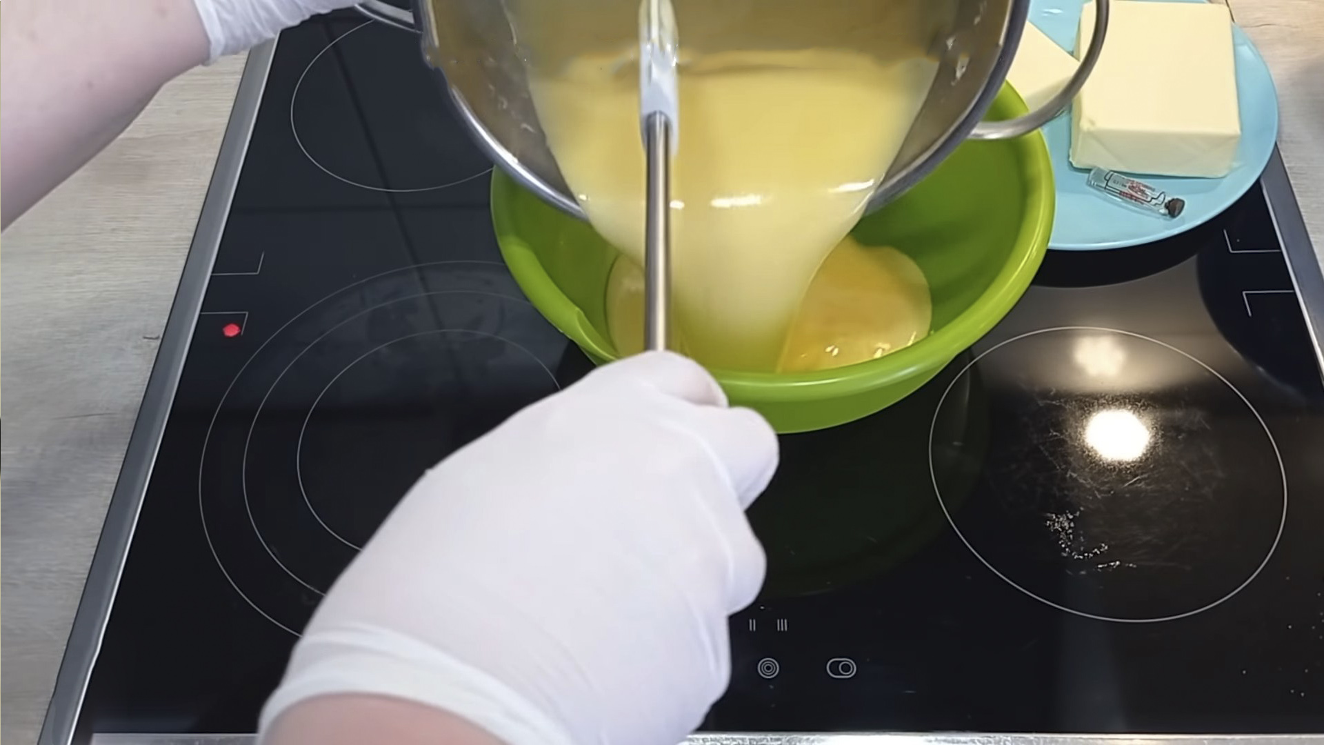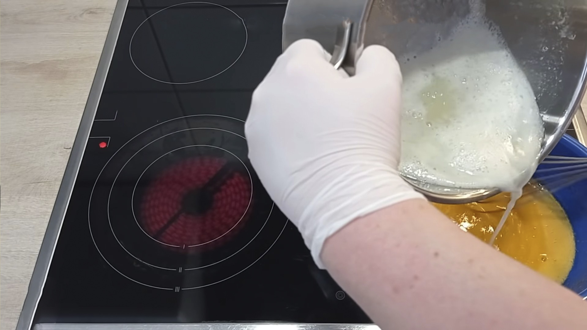 Тонкой струйкой вливаем горячий молочный сироп в желтковую массу, непрерывно помешивая.
