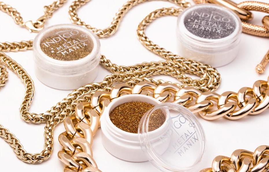 К настоящему моменту появилось несколько видов металлического маникюра, выполняемых с помощью пудры. Это различные цветные варианты, имитирующие золото разной окраски, медь, серебро, платину, железо, сталь, латунь. Они формируют поверхность ногтей с идеально ровным глянцевым покрытием и металлическим блеском. Наносят их на черную подложку, чтобы в полной мере проявить их возможности.