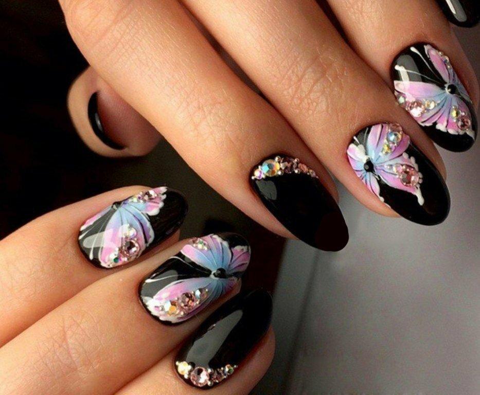 В черном варианте дизайна изображение насекомого смотрится ярко и броско. На фоне черного цвета выгодно выделяются декор и краски. Цветовая гамма рисунка – нежная пастель. Уместны стразы и блестки.