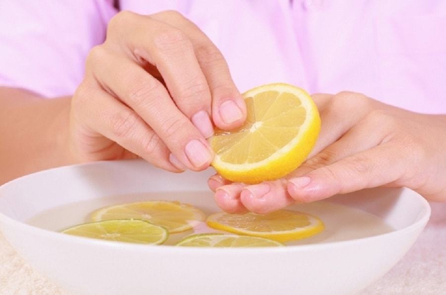 Ванночка с лимонным соком для отбеливания ногтвых пластин.