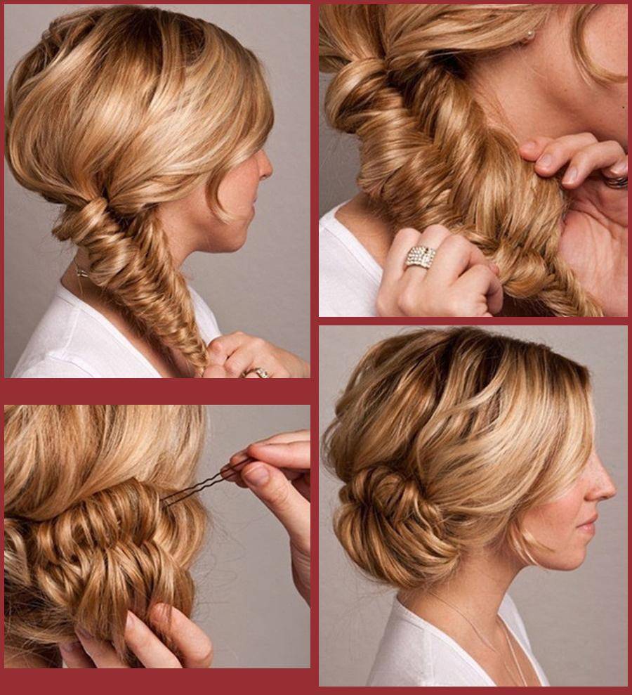 Интересная укладка получится в виде пучка внизу, ее легко выполнить самостоятельно. Просто начните плести хвост русалки на один бок. Растяните секции косы в стороны для придания легкой небрежности. Сверните на затылке в нетугую гульку и закрепите невидимками.