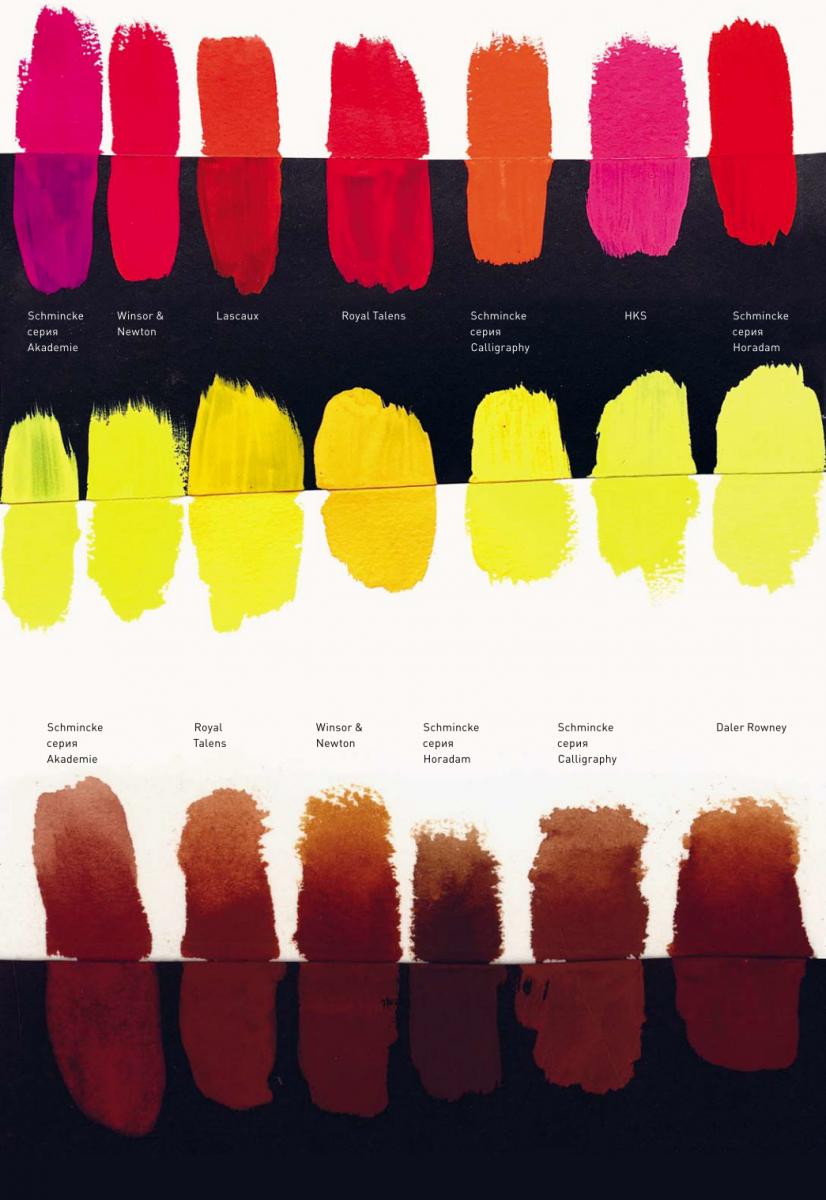 При помощи другого теста можно определить насыщенность отдельных цветов. Эта характеристика называется яркостью. Для проверки проведите полоски по белой (и совершенно черной) бумаге, чтобы понять, какая из красок обладает большей силой свечения. Кстати, краски подороже не слишком светлеют после высыхания.