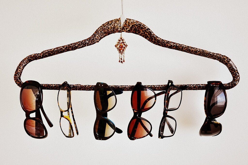 Этот органайзер найдётся в любом шкафу. При желании его можно выбрать и в магазине, если нужна вешалка определённого цвета или размера. В среднем, на обычной вешалке для одежды свободно помещается до 8-ми моделей солнцезащитных очков. Их можно спрятать в шкаф, чтобы не пылились или украсить ими интерьер, повесив на одну из стен.