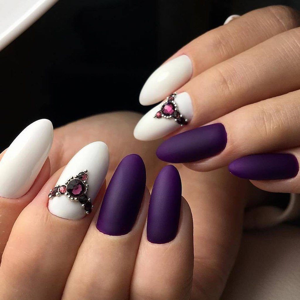 Длинные ногти можно украсить геометрией. Посуда покрыта сиреневым цветом, на который нанесен белый узор: тонкие линии, расположенные на изрядном расстоянии друг от друга и пересекающие поверхность вдоль и поперек. Пересечения можно обозначить несколькими стразами, в идеале тремя одинаковыми по размеру, расположенными в ряд. Прямые линии можно дополнить изогнутыми линиями, подчеркивающими естественный изгиб ногтя. Лучше всего это будет смотреться на миндалевидной форме.