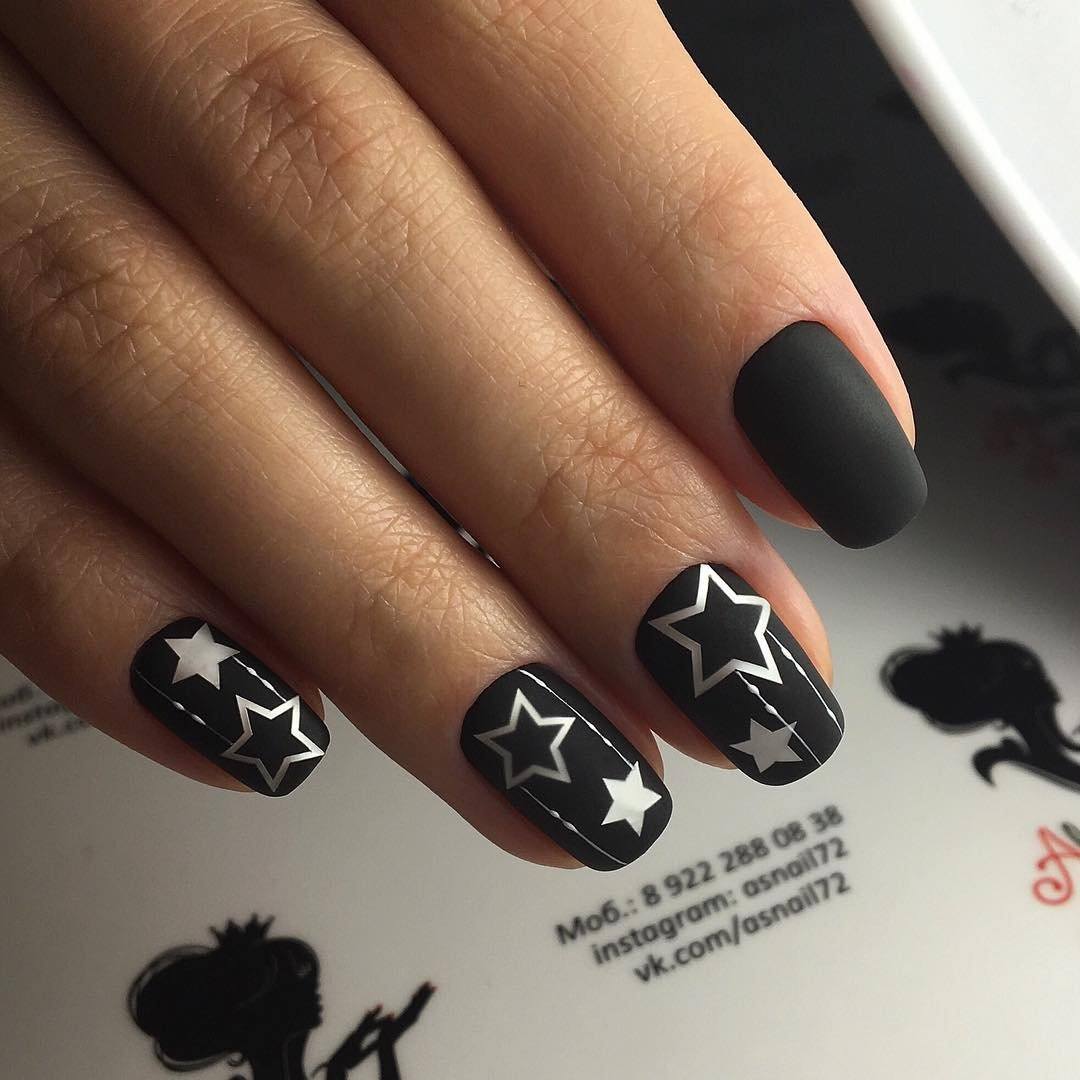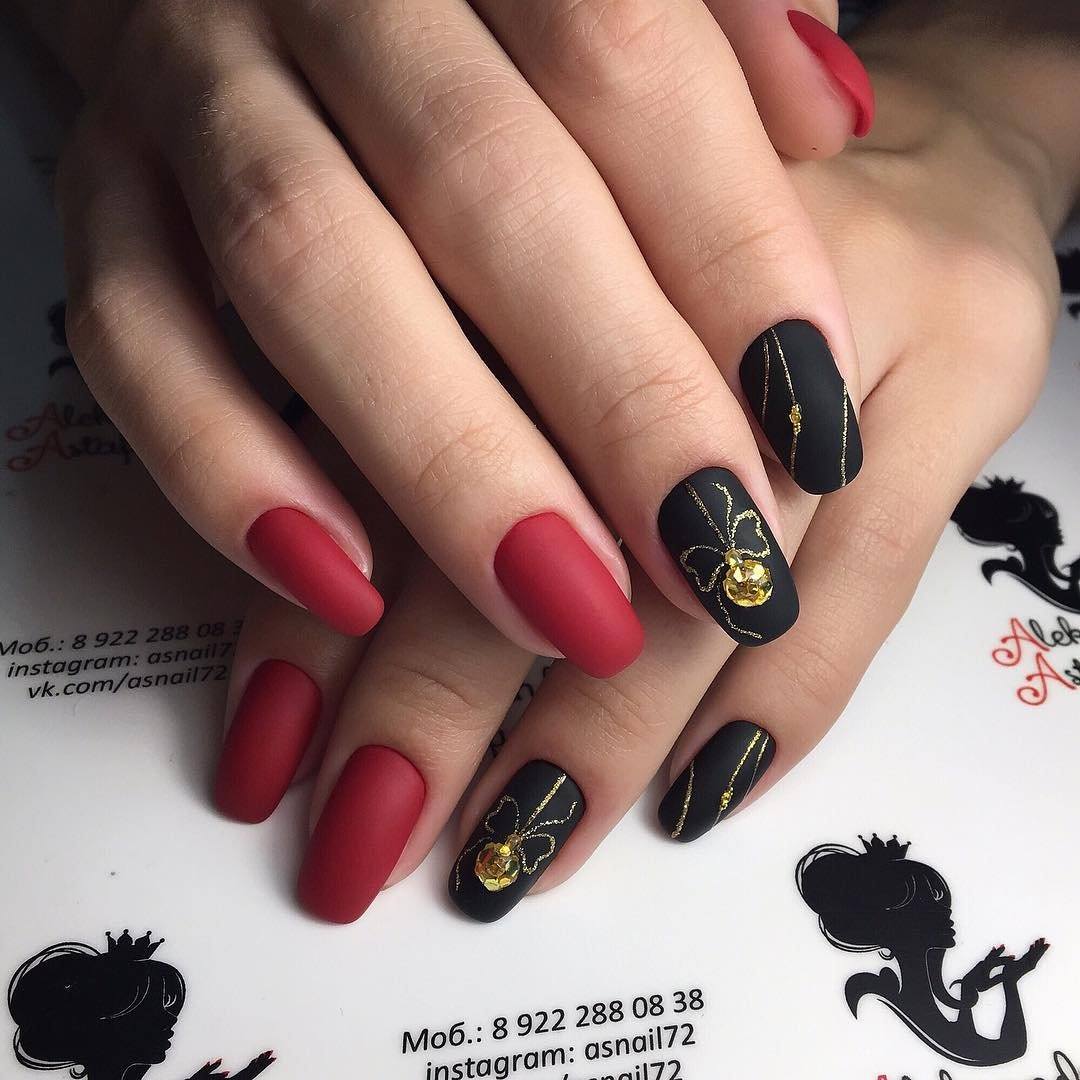 Особенно хорошо смотрится неблестящий лак темных цветов. Можно выбрать классический стильный монохром, а можно сочетать бархатную основу с глянцевыми деталями, с рисунком: