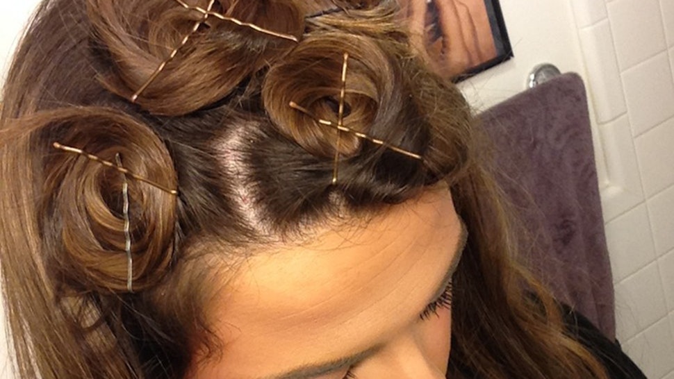 - Поделите волосы на 10-15 одинаковых прядей в зависимости от густоты, скрутите каждую в кольцо и зафиксируйте у корней при помощи невидимки.