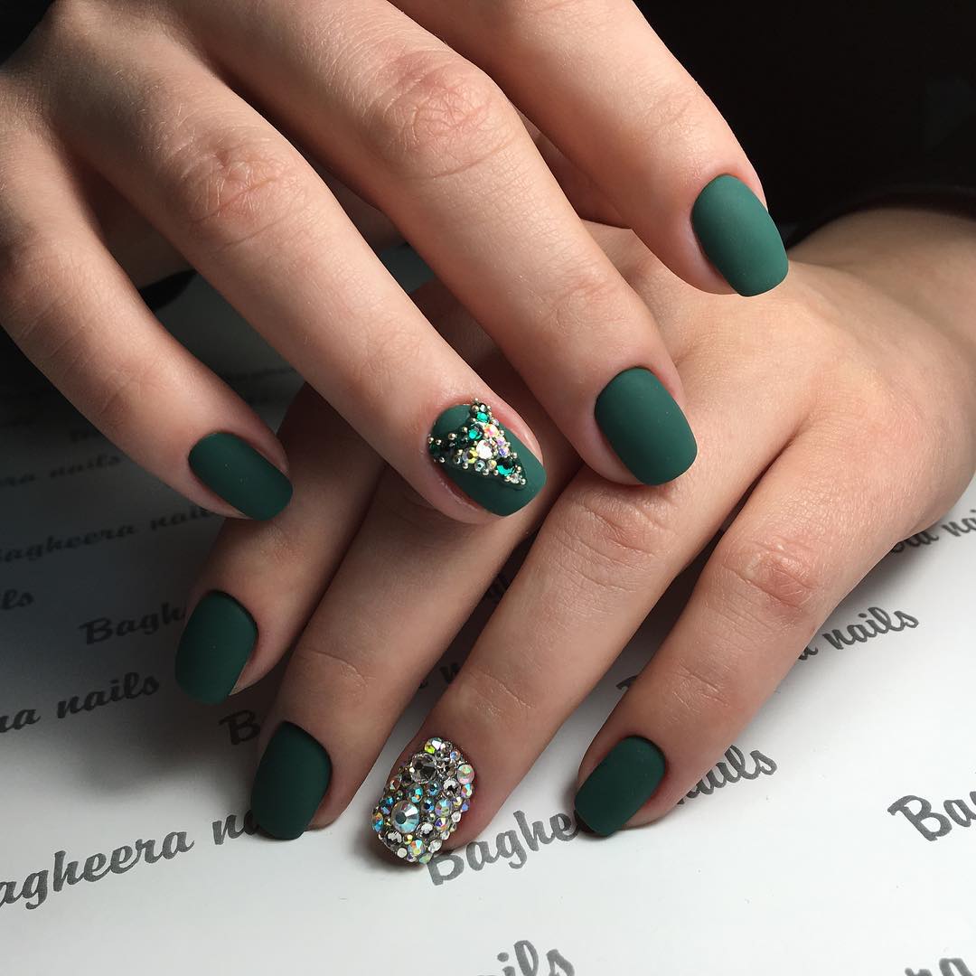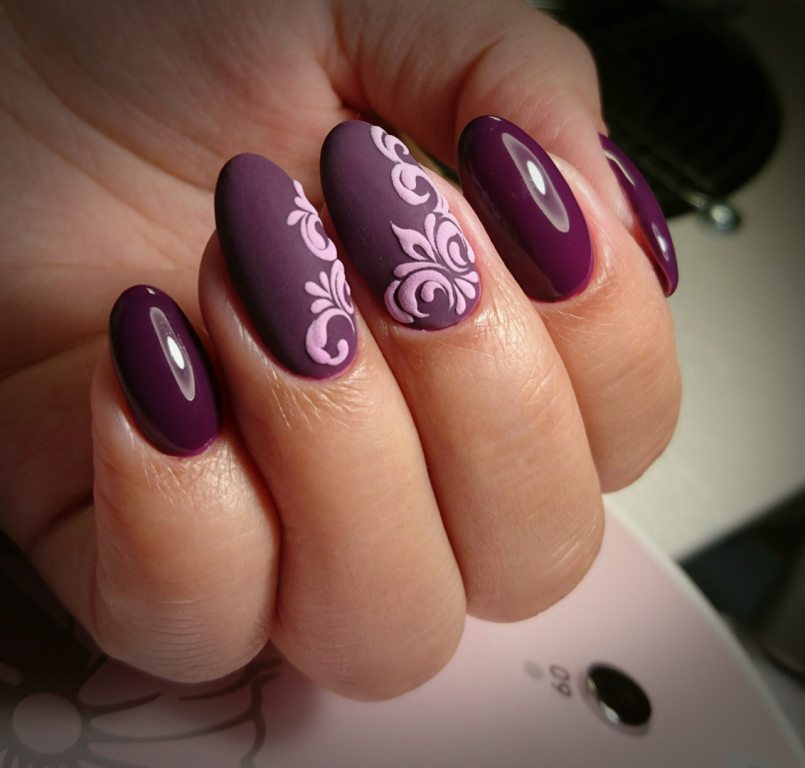 Особенно хорошо смотрится неблестящий лак темных цветов. Можно выбрать классический стильный монохром, а можно сочетать бархатную основу с глянцевыми деталями, с рисунком: