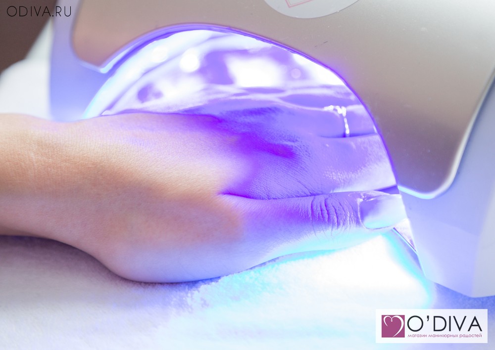- Сушим ноготки в лампе, пока материал не застынет. Если у вас LED-лампа, будет достаточно пол минутки, для УФ-лампы время продлевается до 2 минут.