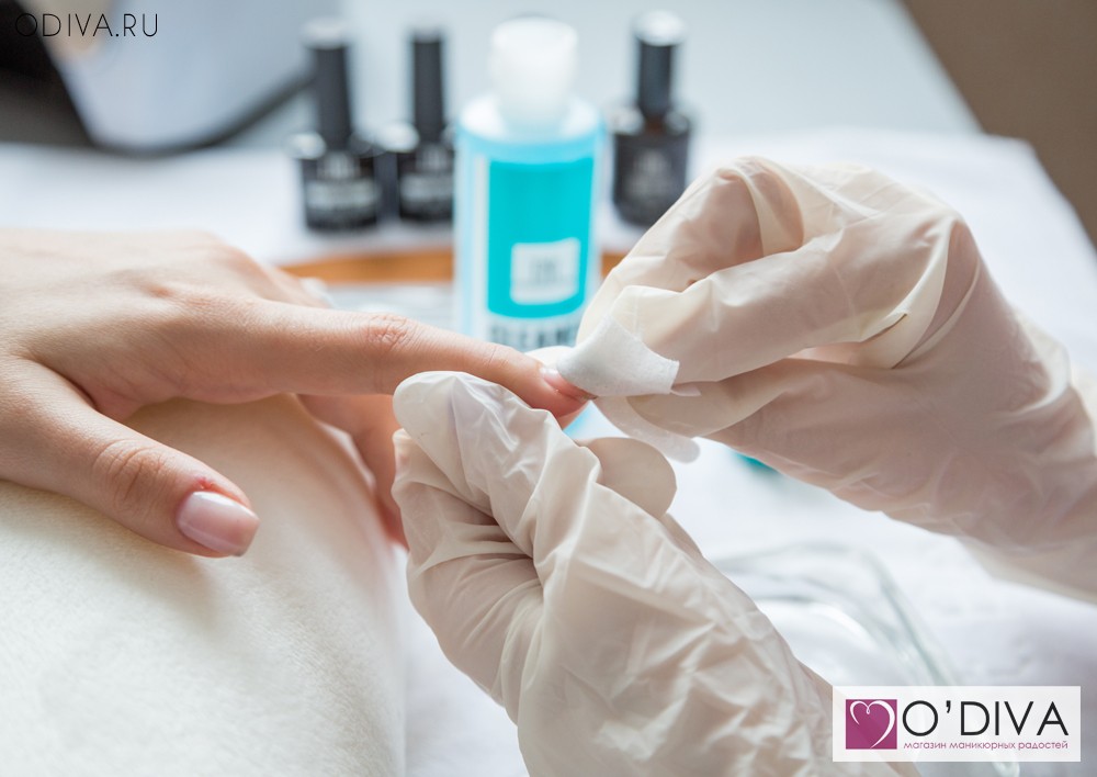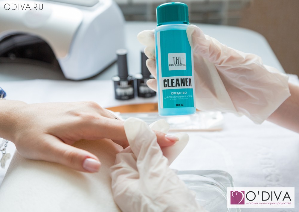 После проведения маникюра обезжириваем ноготок и удаляем все излишки пыли, кожного жира при помощи клинсера и безворсовых салфеток.