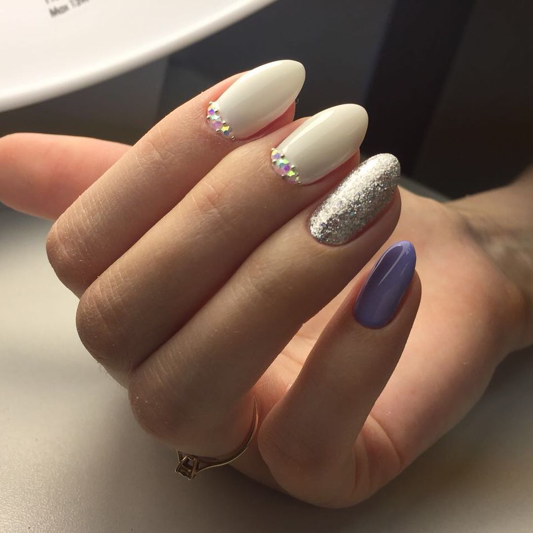 Если у вас есть стразы и хотя бы 2 оттенка гель-лака, среди которых белый, вы сможете повторить следующий интересный дизайн. Техника «вязаный маникюр» пошагово выглядит так: