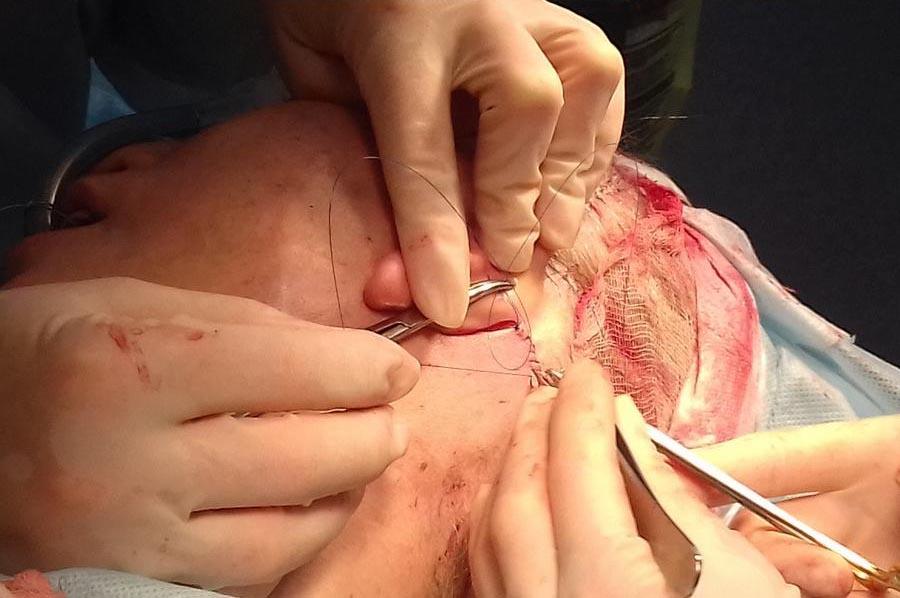 Когда наложены разгрузочные швы, можно приступать к ушиванию разрезов. При этом для каждого участка выбирается своя методика. Для зоны роста волос на голове я использую обвивной шов. Этот этап требует чисто женского терпения и аккуратности. Стежки надо выполнять предельно равномерно, добиваясь строго одинакового натяжения по всей длине рубчика. Это позволяет обеспечить равномерность нагрузки и обеспечивает сохранность волосяных фолликулов вокруг разреза.